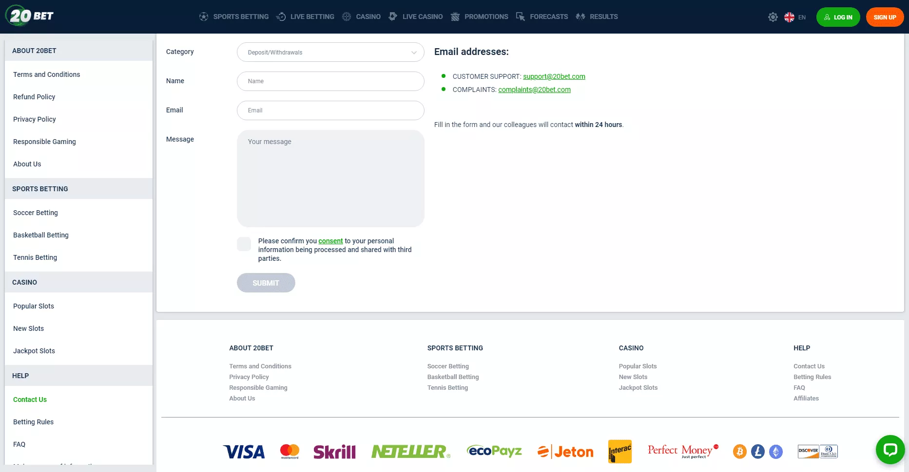 20Bet oferuje profesjonalną, całodobową obsługę klienta dostępną przez e-mail i czat online. Usługi są dostępne przez całą dobę, a personel wsparcia mówi po polsku.
