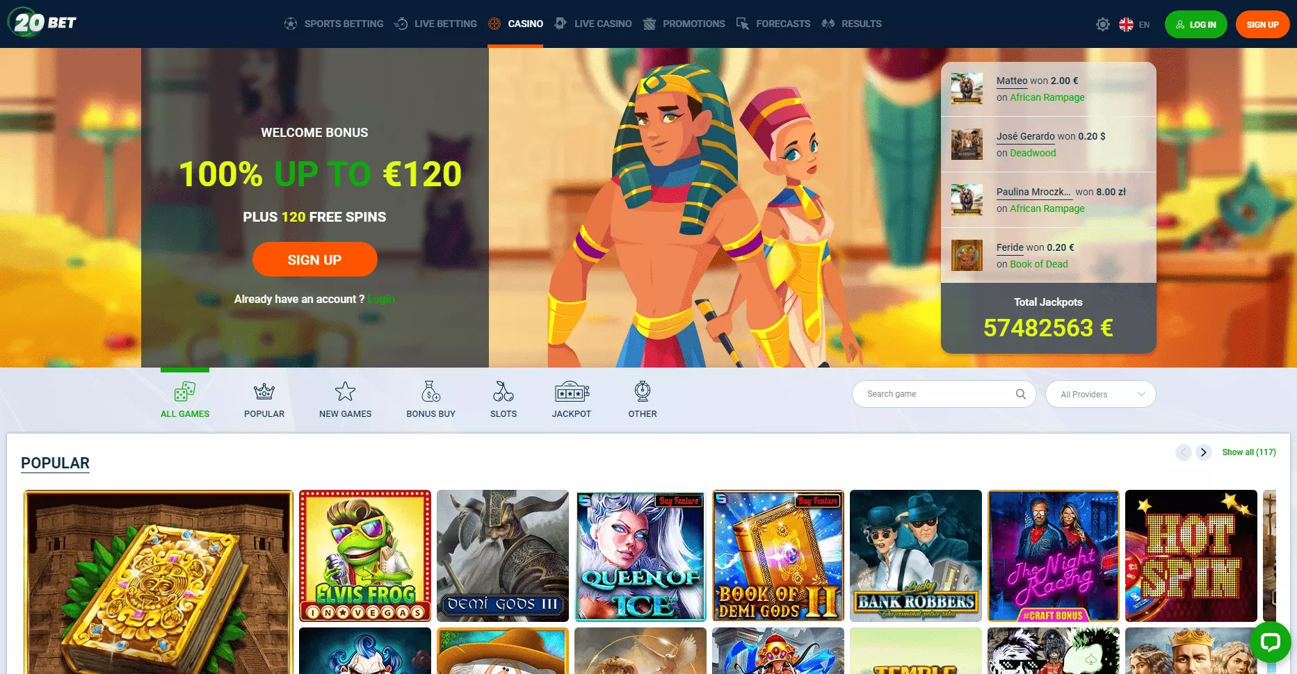 Śmiało można powiedzieć, że na pierwszy rzut oka ich oferta jest z półki tych lepszych. Tutaj warto też zaznaczyć, że 20Bet to nie tylko onlinekasyno, ale i zakłady sportowe, i zakłady bukmacherskie na żywo. Oferują nam następujące bonusy: