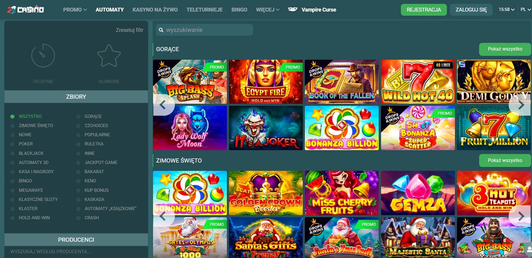 Kasyno online 22Casino działa od 2018 roku. Serwis udostępnia ponad 10 000 gier, w tym automaty, stoły karciane i sekcję live casino. Platforma oferuje aplikację na iOS i Android, a program VIP przewiduje cashback do 11%. Dostępne są szybkie metody płatności i całodobowa obsługa klienta w języku polskim. Gry pochodzą od renomowanych dostawców. Strona kasyna jest przetłumaczona na ponad 60 języków. Poniższa recenzja 22Casino dla polskich graczy w 2026 roku szczegółową przedstawia ofertę operatora.