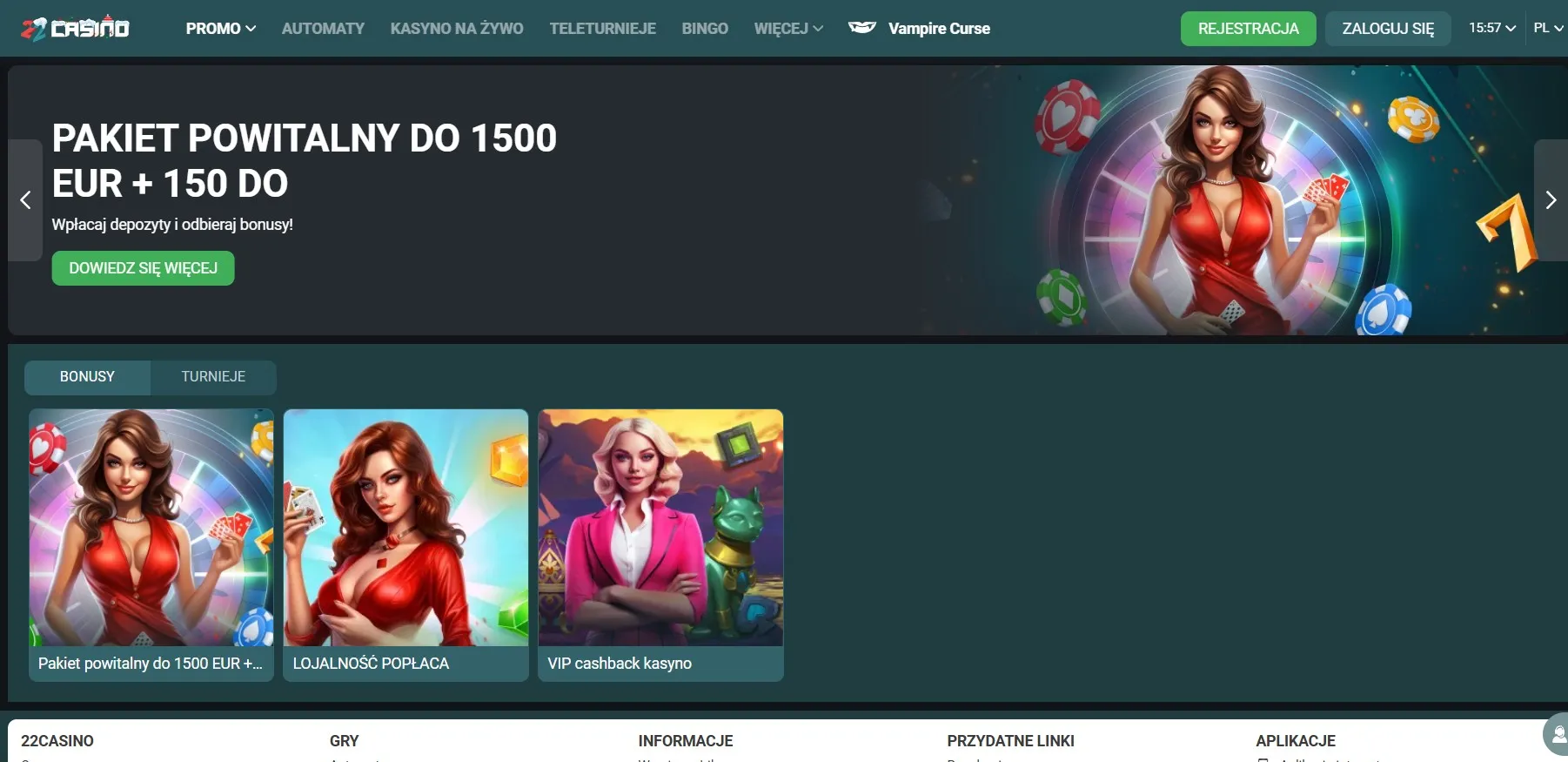 Kasyno 22Casino oferuje rozbudowany pakiet powitalny, obejmujący do 6000 PLN bonusu i 150 darmowych obrotów, rozdzielonych na cztery pierwsze depozyty. Każdy depozyt ma określone warunki minimalnej kwoty, wysokość bonusu oraz liczbę darmowych obrotów. Dodatkowo po dziesiątym depozycie gracze mogą skorzystać z promocji „Lojalność się opłaca”, obejmującej bonus 50% na automatach oraz dodatkowe darmowe obroty.