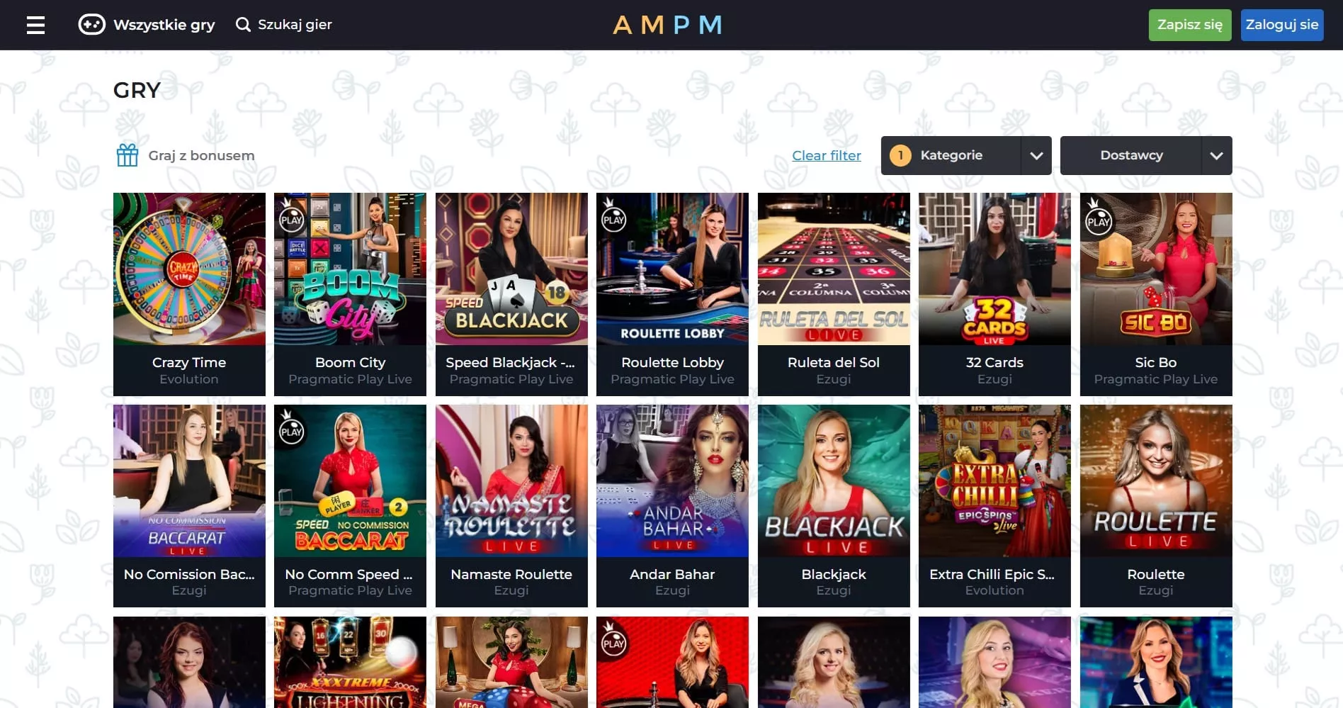 Sekcja kasyno na żywo w AMPM została przez naszych ekspertów oceniona jako jedna z najmocniejszych części platformy. Znajdują się tu setki gier prowadzonych przez prawdziwych krupierów w czasie rzeczywistym, co pozwala graczom poczuć atmosferę profesjonalnego kasyna.