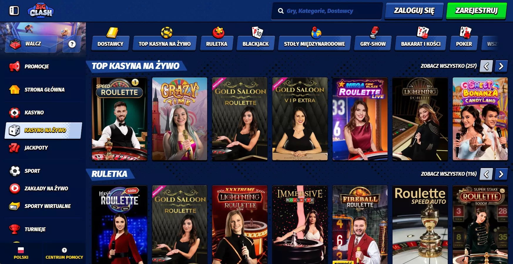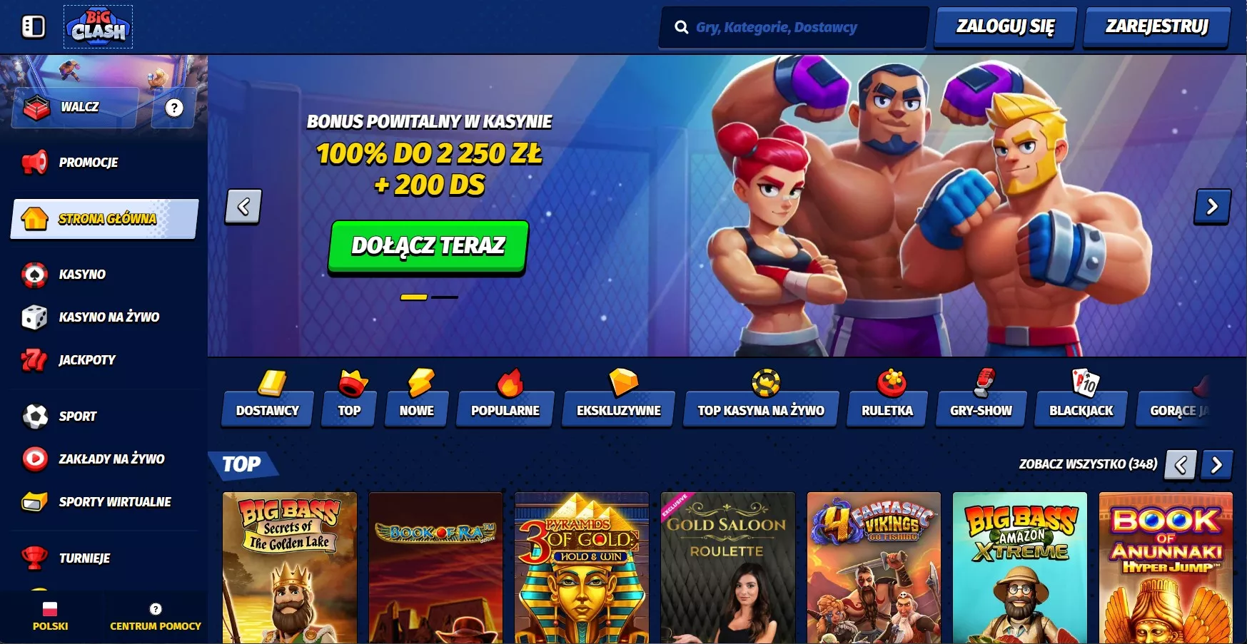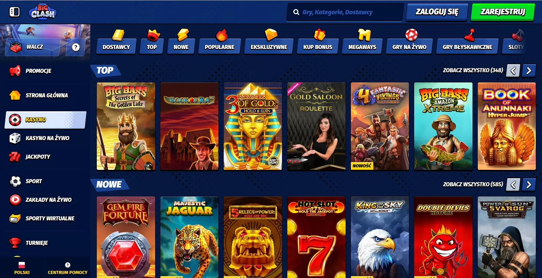 W bibliotece gier kasyna BigClash znajduje się ponad 7500 tytułów od 90 renomowanych dostawców. Platforma oferuje szeroki wybór kategorii, w tym sloty, gry stołowe, kasyno na żywo, tytuły z mechaniką Megaways, gry z opcją zakupu bonusu oraz błyskawiczne rundy.