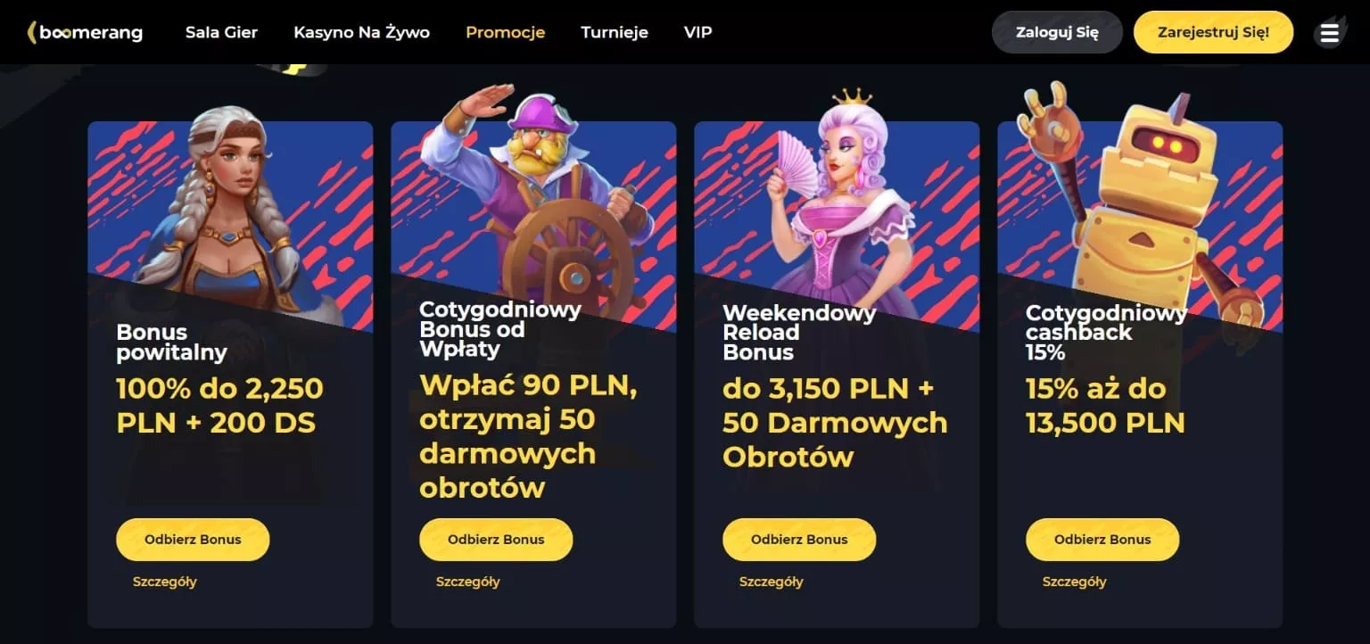 Członkowie mogą poprosić o bonus bez depozytu Boomerang casino albo tygodniowy bonus od depozytu po przyzwyczajeniu się do sposobu działania kasyna Boomerang. Ta promocja oferuje 50% bonusu aż do 700€ oraz 200 Boomerang kasyno free spiny.