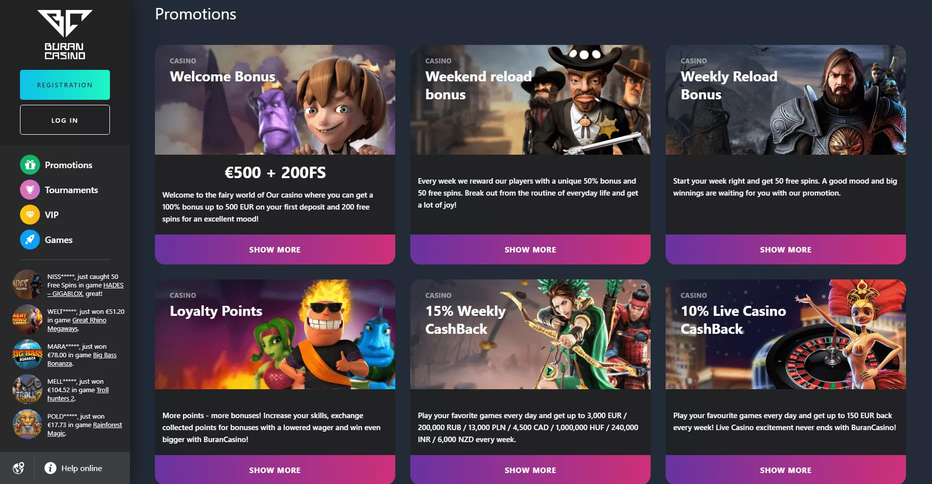 Gracze, którzy zdecydują się odwiedzić Buran kasyno internetowe, mogą korzystać z licznych ofert promocyjnych, turniejów dla graczy, wydarzeń specjalnych oraz zyskiwać jeszcze więcej w ekskluzywnym programie VIP.