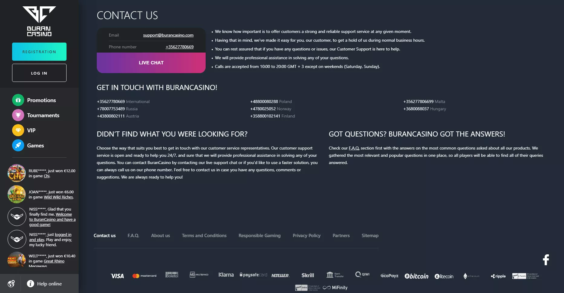 W Buran casino kontakt z obsługą jest możliwy w wielu językach, w tym w języku polskim. Najszybszym i najbardziej efektywnym sposobem na nawiązanie kontaktu z pracownikami kasyna jest skorzystanie z czatu na żywo, który można uruchomić, wybierając ikonę rozmowy w menu po lewej stronie. Konsultanci kasyna są dostępni przez całą dobę, siedem dni w tygodniu.