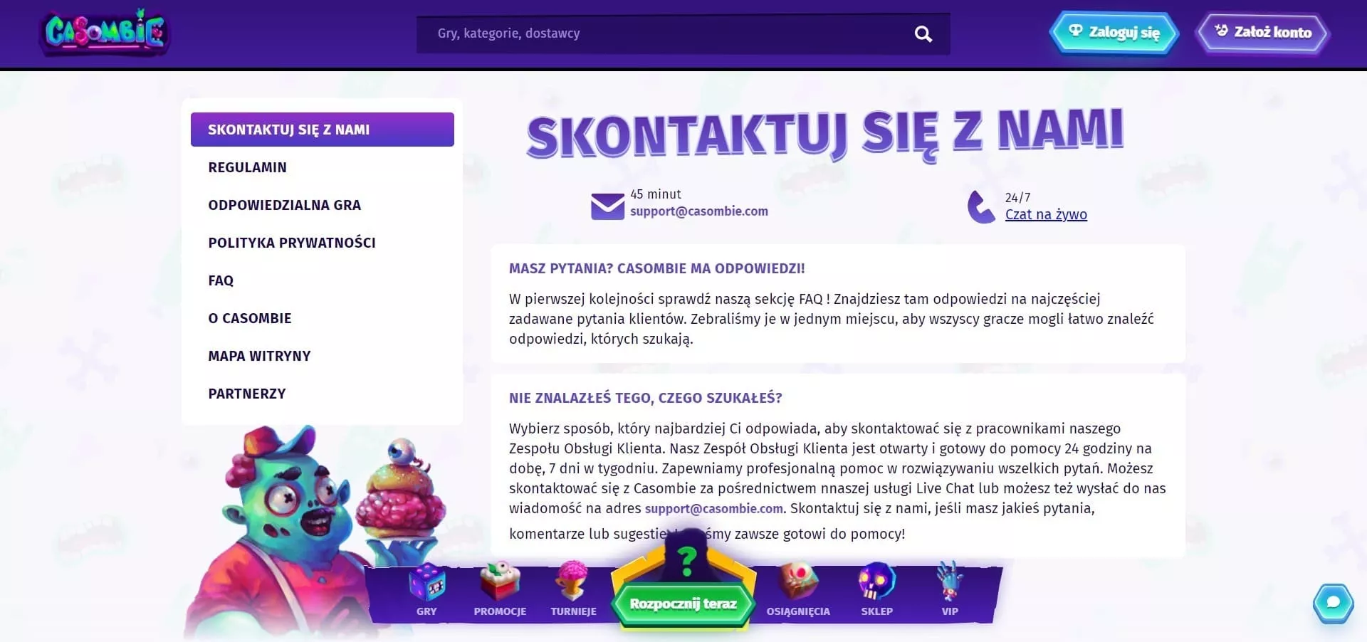Jeśli masz jakiekolwiek pytania lub problemy związane z grami w Casombie Casino, możesz skontaktować się z ich Międzynarodowym Centrum Obsługi Klienta Casombie Casino kontakt . Są one Otwarte 24/7 każdego dnia w roku i pomoże Ci w wszelkich pytań, które mogą mieć. Możesz skontaktować się za pośrednictwem szybkiego czatu na żywo. Aby uzyskać najszybszą pomoc, zawsze możesz skorzystać z Casombie Casino opinie lub zadzwonić do nich na międzynarodową infolinię.