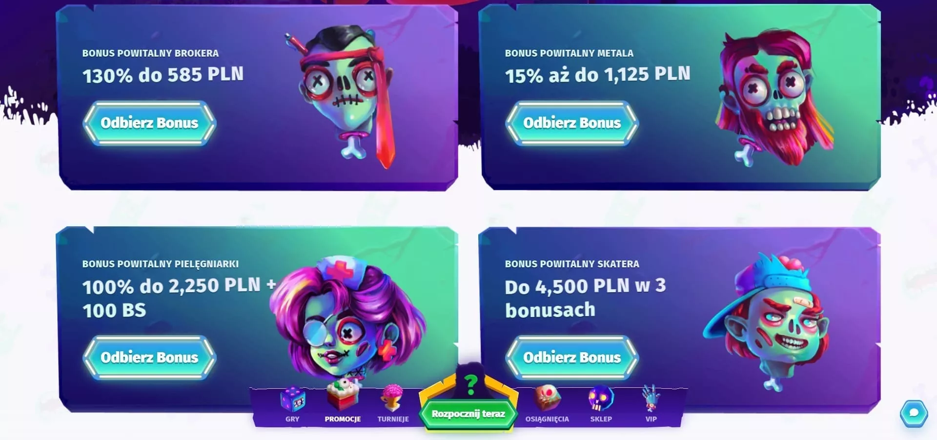 Casombie Casino PL oprócz interesującej identyfikacji wizualnej posiada również rozbudowaną ofertę bonusową. Nowi użytkownicy mogą skorzystać z aż 7 różnych bonusów powitalnych, które nazwane zostały imionami różnych zoombie.