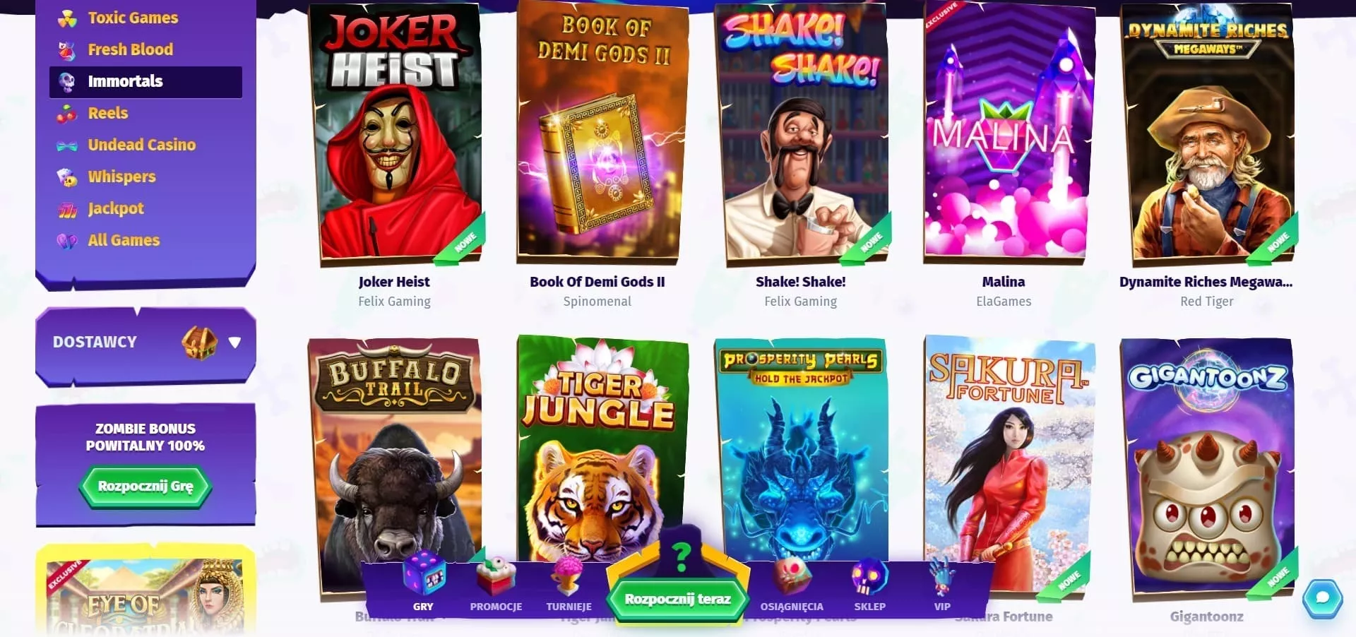 Na przykład interfejs CasombieCasino jest bardzo wyjątkowy. W grach wykorzystano asymetryczne miniatury, a niektóre z nich dodały nawet elementy o tematyce zombie, takie jak mózgi, kości, krew i inne rzeczy. Branding jest widoczny również w kategoriach, ponieważ możesz przeglądać Casombie Casino najlepsze gry za pomocą filtrów, takich jak gry “Immortals” i “Fresh Blood”.