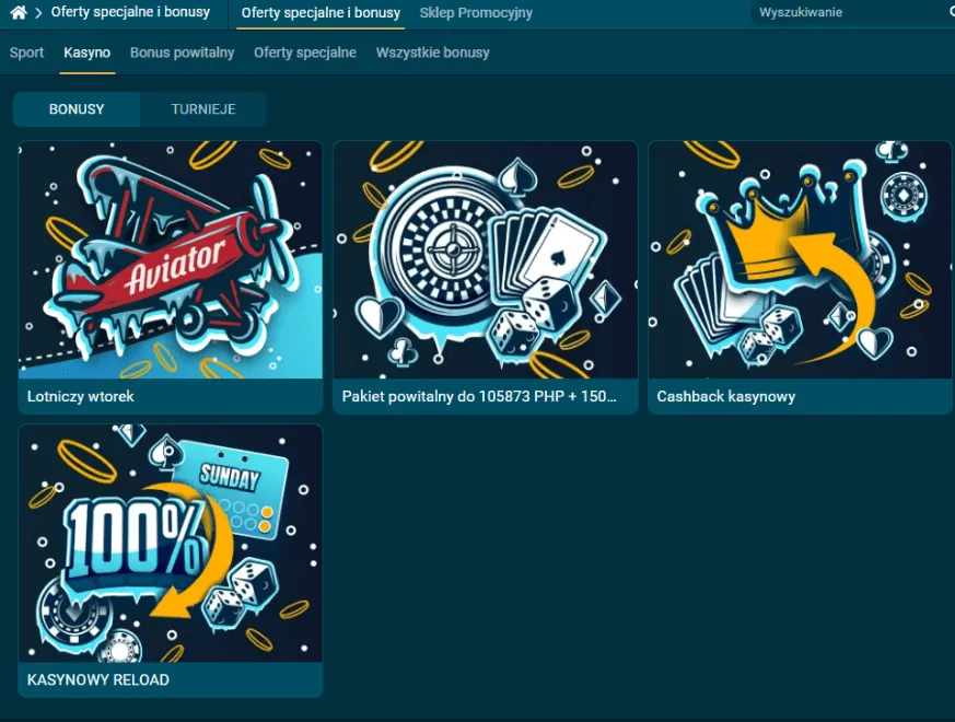 Nowi użytkownicy mogą skorzystać z pakietu powitalnego obejmującego do 6291 PLN oraz 150 darmowych spinów, rozłożonych na cztery pierwsze depozyty: