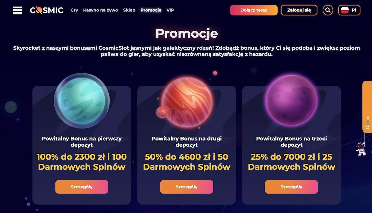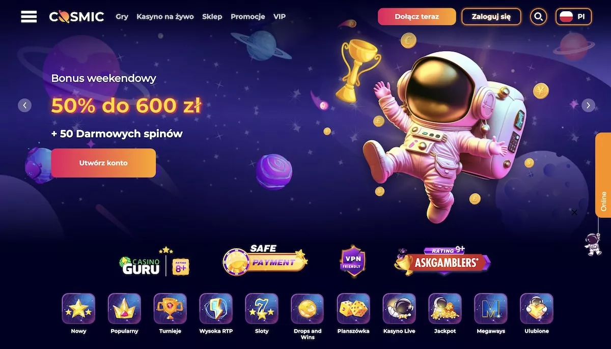 Jeśli jesteś pasjonatem gier hazardowych i poszukujesz kosmicznej przygody, to jesteś we właściwym miejscu. W tej recenzji przedstawimy Ci wszystkie kluczowe informacje o kasynie CosmicSlot, w tym jego ofertę gier, bonusy, bezpieczeństwo i wiele więcej. Przygotuj się na niezapomnianą podróż przez przestrzeń kosmiczną pełną emocji i szans na wygrane!