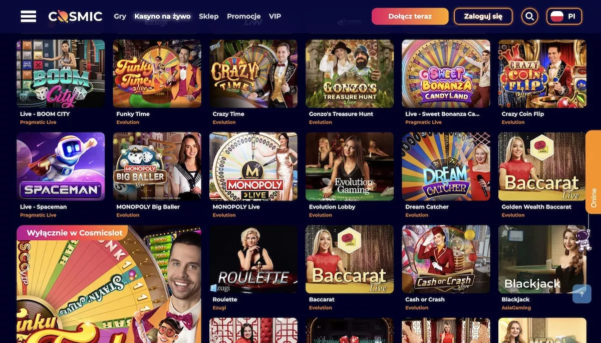 Kasyno CosmicSlot oferuje szeroki wybór gier kasynowych i automatów, które dostępne są dla polskich graczy. Możesz cieszyć się różnorodnością rozrywki, obejmującą takie kategorie jak automaty, gry stołowe, gry na żywo i wiele więcej.
