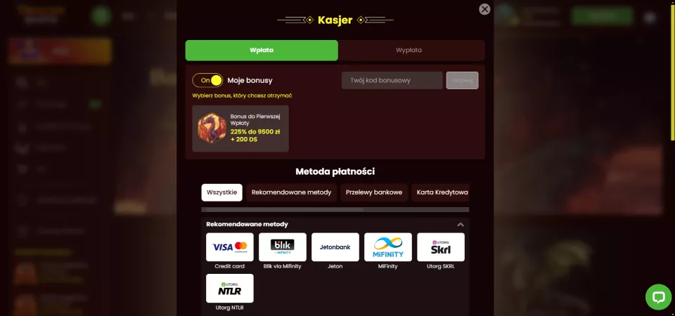 225% do 9500 PLN i 200 free spinów.