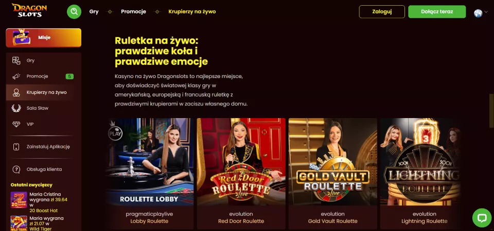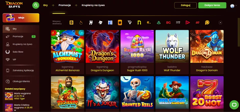 Testując DragonSlots Casino, wypróbowałem wiele gier – od dynamicznych slotów, takich jak Gates of Olympus, po ekscytujące gry na żywo, w tym Crazy Time. Najbardziej przypadł mi do gustu bonus powitalny oraz możliwość kupowania bonusów w grach takich jak Sugar Rush 1000. Najwygodniejszym rozwiązaniem płatniczym okazały się kryptowaluty, które oferują błyskawiczne wypłaty. Polecam dokładne zapoznanie się z regulaminem promocji przed grą. To kasyno naprawdę robi wrażenie!