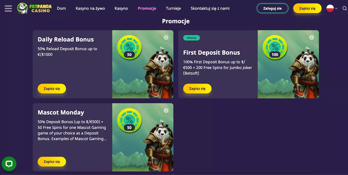 Jeśli chodzi o ofertę bonusów w tym kasynie, to warto wymienić tu między innymi Fat Panda bonus na start, a także bonus za doładowanie oraz cotygodniowy bonus Happy Friday. Operator zapewnia również oferty darmowych spinów dostępne na automatach.