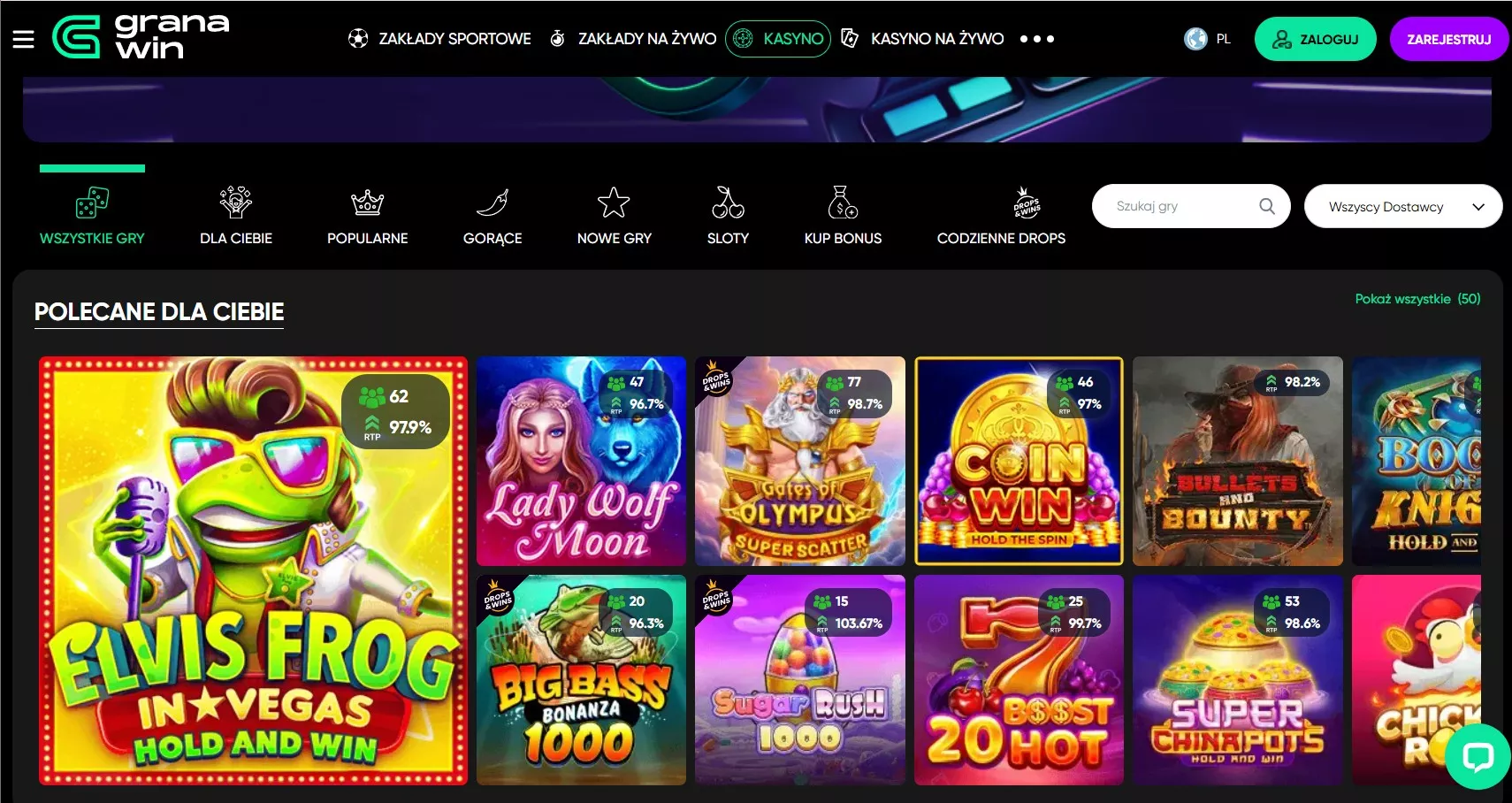 Portal hazardowy udostępnia bibliotekę ponad 10 000 gier od blisko 100 różnych dostawców oprogramowania. Tak szeroki wybór obejmuje wszystkie popularne gry kasynowe Granawin: sloty, gry stołowe, ruletkę, blackjacka, bakarata, tytuły z jackpotami, gry błyskawiczne, gry z funkcją Bonus Buy oraz kasyno na żywo.