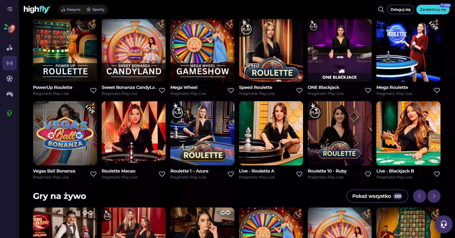 Kasyno wirtualne Highflybet posiada ponad 6000 gier od 80+ dostawców. Gracze mogą korzystać z wielu kategorii: sloty, gry na żywo, gry stołowe, wygrana błyskawiczna, jackpoty, klub bonus, zdrapki, oryginalne, Drops and Wins.