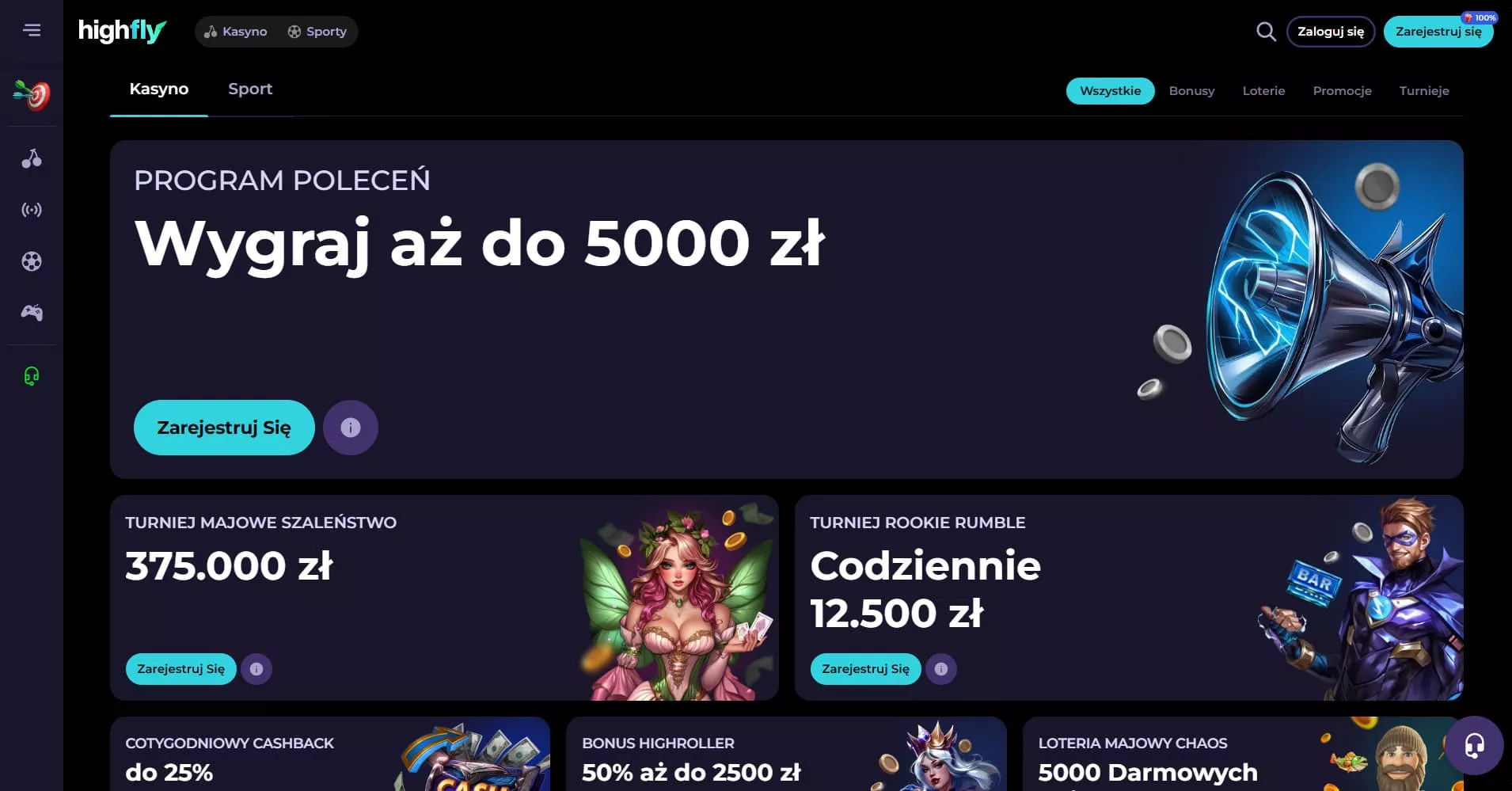 Kasyno Highflybet zostało założone w 2024 roku, działa na podstawie licencji Curacao i jest zarządzane przez firmę Terdersoft B.V. Platforma oferuje ponad 6000 gier, w tym automaty, gry stołowe i kasyno na żywo. Strona dostępna jest w ponad 10 językach, w tym po polsku. Bonus powitalny to 100% do 500 PLN. Miesięczne limity wypłat sięgają 60 000 PLN. Ta recenzja kasyna Highflybet dla polskich graczy w 2026 roku przedstawia najważniejsze informacje, z którymi warto się zapoznać przed rejestracją na platformie.