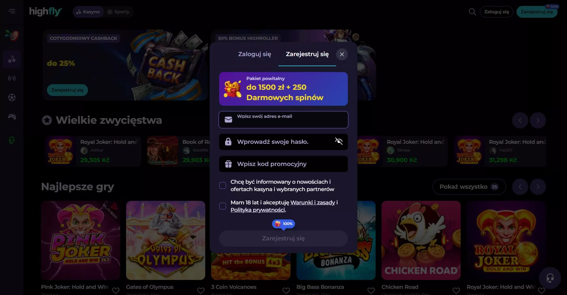 Logowanie do kasyna Highflybet odbywa się poprzez kliknięcie przycisku „Zaloguj się” w prawym górnym rogu strony głównej. Następnie należy wpisać swój adres e-mail i hasło użyte przy rejestracji.