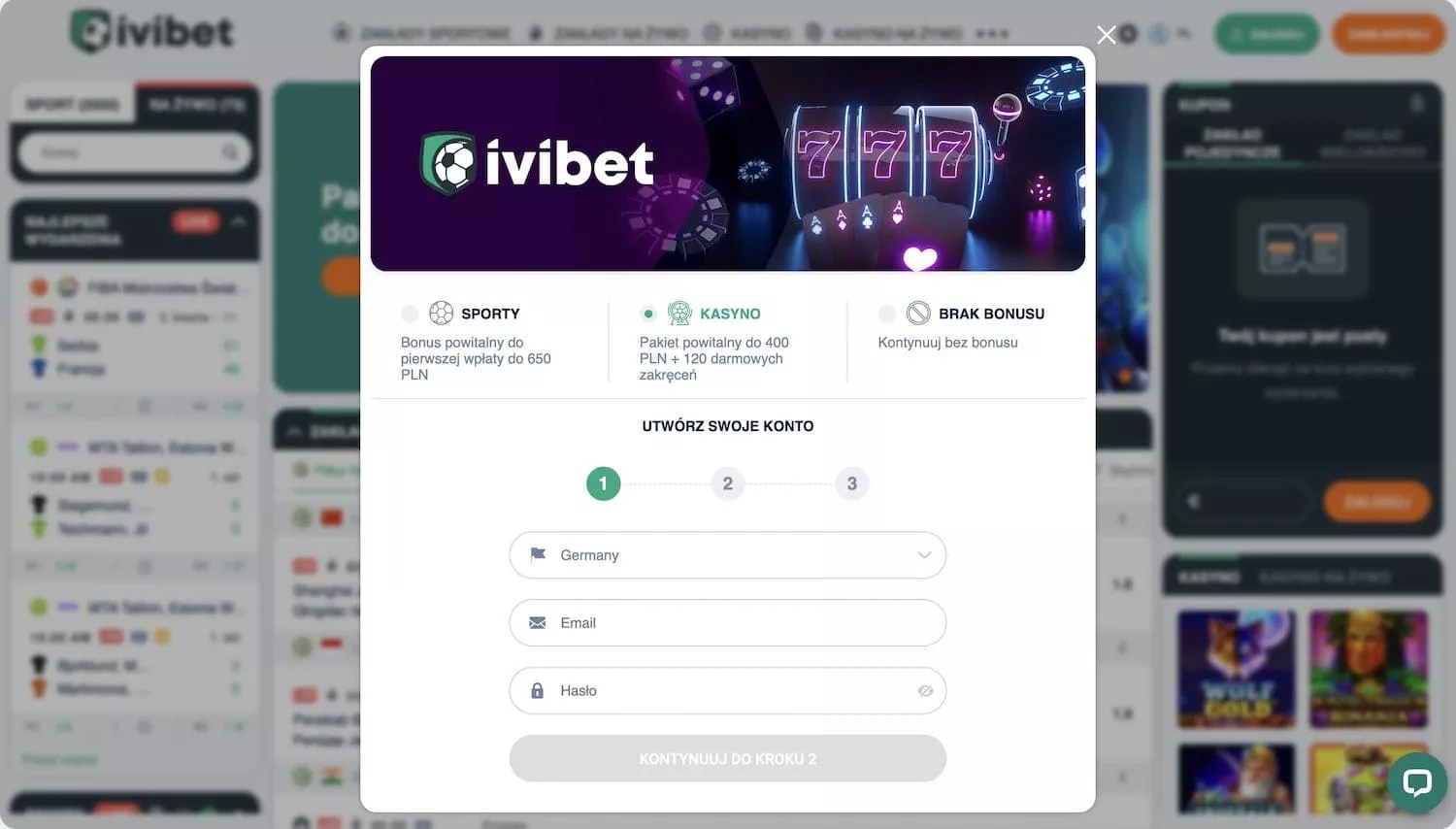 Oficjalnie IviBet Casino nie oferuje bonusu bez depozytu, ale w zamian przygotowało do wyboru atrakcyjny bonus depozytowy. Przy rejestracji wybierasz, który bonus interesuje właśnie Ciebie, więc zdecyduj mądrze. Czy chcesz zyskać premię do kasyna, czy na zakłady bukmacherskie?