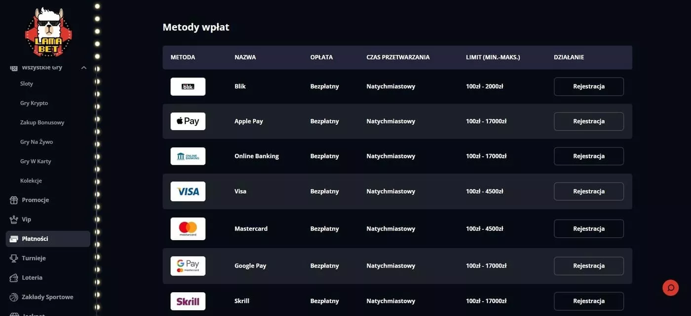 Wybór opcji płatności w LamaBet powinien zaspokoić każdego. Wśród możliwości na wpłaty i wypłaty można znaleźć popularnych operatorów kart, opcje wpłaty przez pre-paid, portfele elektroniczne i kryptowaluty.