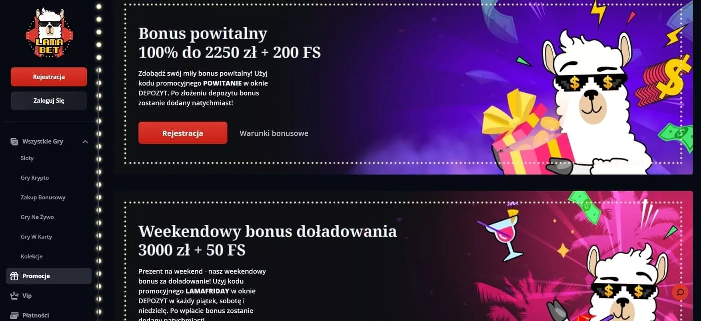 Bonus powitalny to zaledwie jeden z kilku dostępnych dla społeczności kasyna. W zakładce ofert zauważamy też inne nowe bonusy w kasynie Lamabet 2026:
