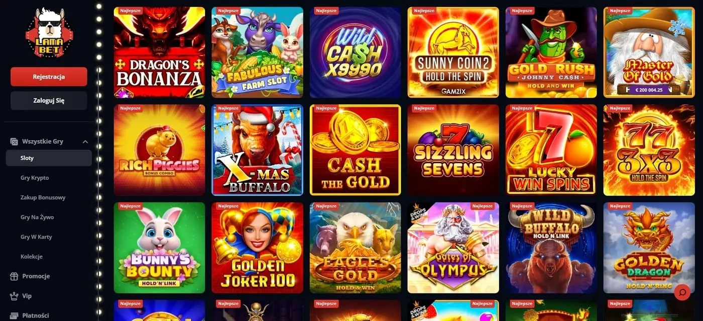 Gry slot to pierwsza i największa kategoria automatów w LamaBet. Do dyspozycji graczy są filtry gier ze względu na ich motyw przewodni. Sloty można testować jako demo za darmo. Wśród najpopularniejszych gier slot LamaBet znalazły się: