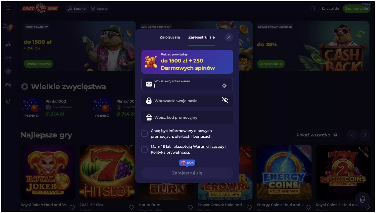 Lazybar, założone w 2024 roku, to nowoczesna platforma hazardowa, która wyróżnia się atrakcyjnymi bonusami i różnorodnością usług. Nowi gracze mogą skorzystać z bonusu powitalnego wynoszącego 100% do 500 PLN i 150 darmowych spinów. Strona dostępna jest w ponad 15 językach, co świadczy o jej międzynarodowym charakterze.