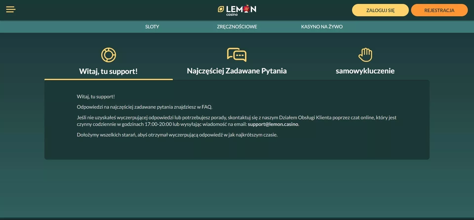 kontakt mailowy: support@lemon.casino,