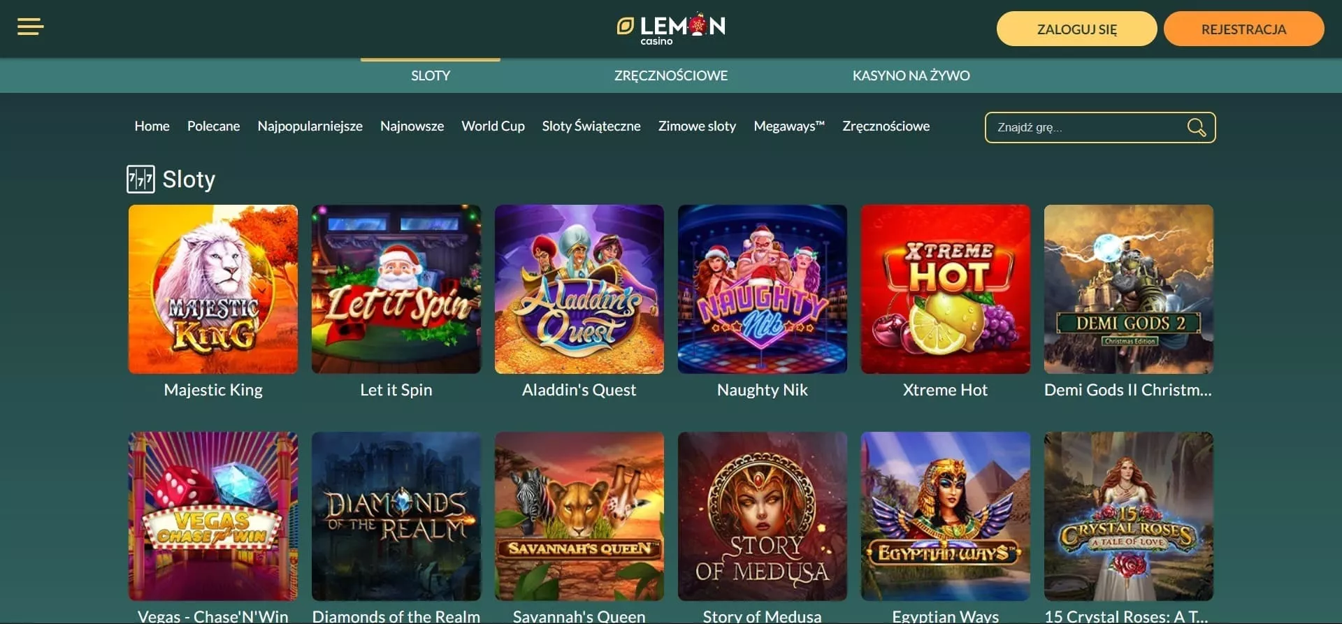 Nasi eksperci przeanalizowali rodzaje gier dostępne na platformie Lemon Casino, zwracając uwagę na szeroki wybór tytułów, ich jakość oraz dostępność wersji mobilnej. Według naszych testów casino Lemon oferuje ponad 4800 gier kasynowych, co zapewnia duży wybór zarówno dla początkujących, jak i bardziej wymagających graczy. W ofercie dostępne są sloty, gry stołowe, gry karciane, kasyno na żywo oraz liczne gry hazardowe online od najlepszych dostawców gier. Tak szeroki wybór pozwala znaleźć zarówno klasyczne tytuły, jak i nowe gry publikowane przez czołowe studia.