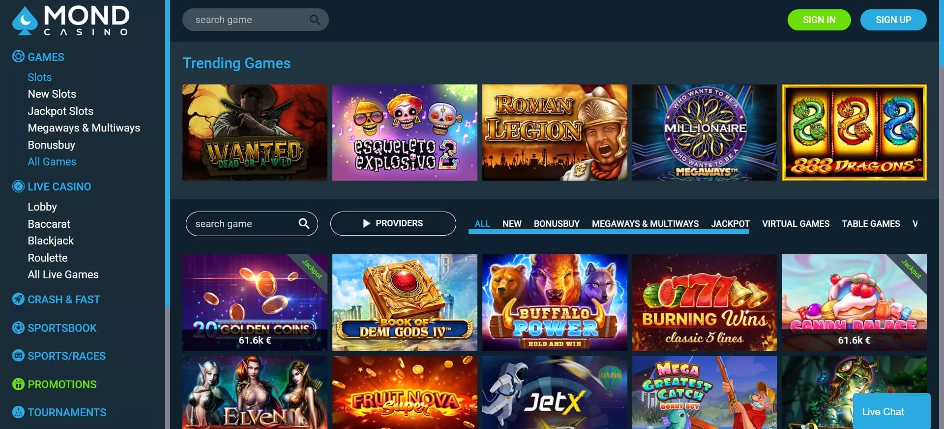 Mond automaty obejmują nowe sloty, sloty z Jackpotami, sloty Megaways oraz Multiways, sloty Bonus Buy. Popularne tytuły: Wanted Dead or a Wild, 27 Eternal Hot, Roman Legion.