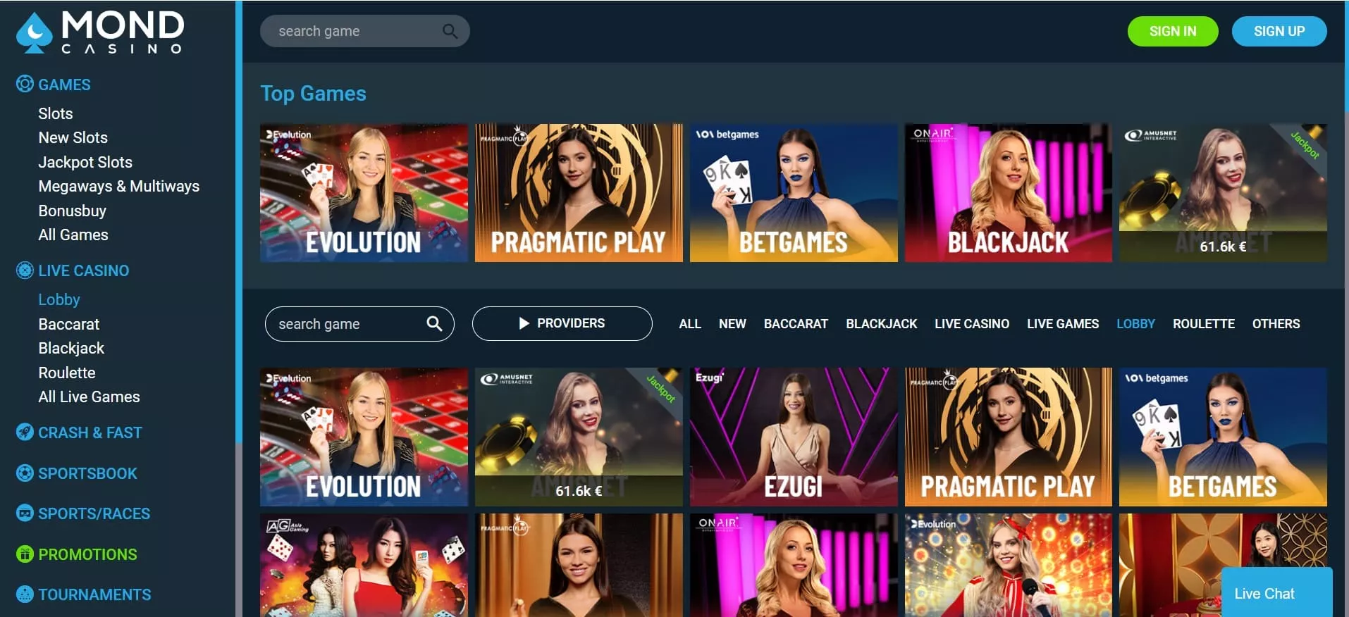Polskie kasyno online Mond zapewnia dostęp do gier od 76 dostawców oprogramowania. Wchodząc do lobby gier, gracze będą mieli możliwość filtrowania dostępnych tytułów wedle producentów w każdej osobnej sekcji i kategorii: gry online, sloty, gry na żywo czy gry Crash & Fast.
