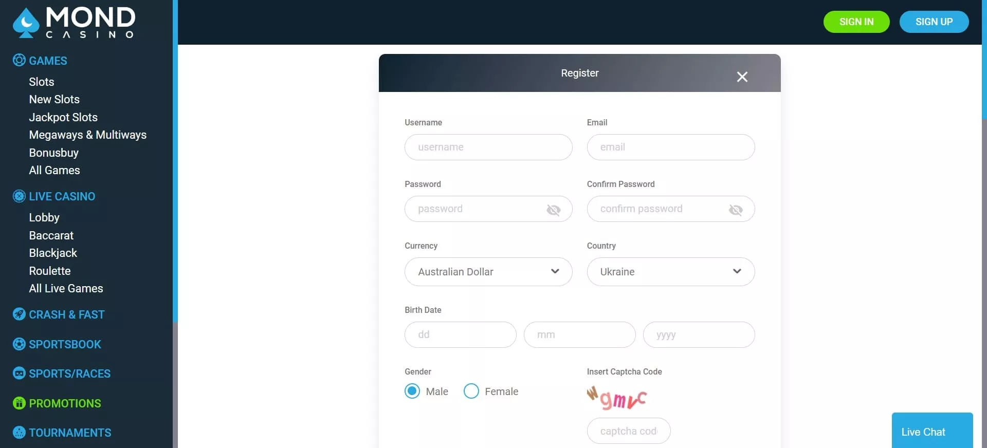 Kasyno Mond nie zapewnia dostępu do gier w wersji demo. Aby zagrać na prawdziwe pieniądze, ukończ rejestrację, przejdź do lobby gier i wybierz docelową grę.