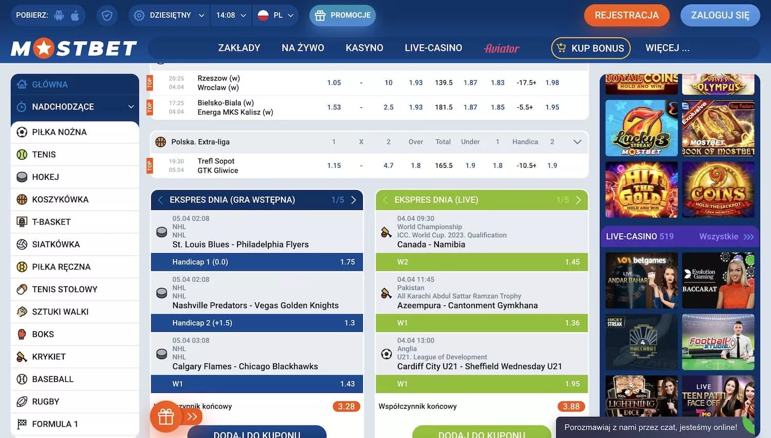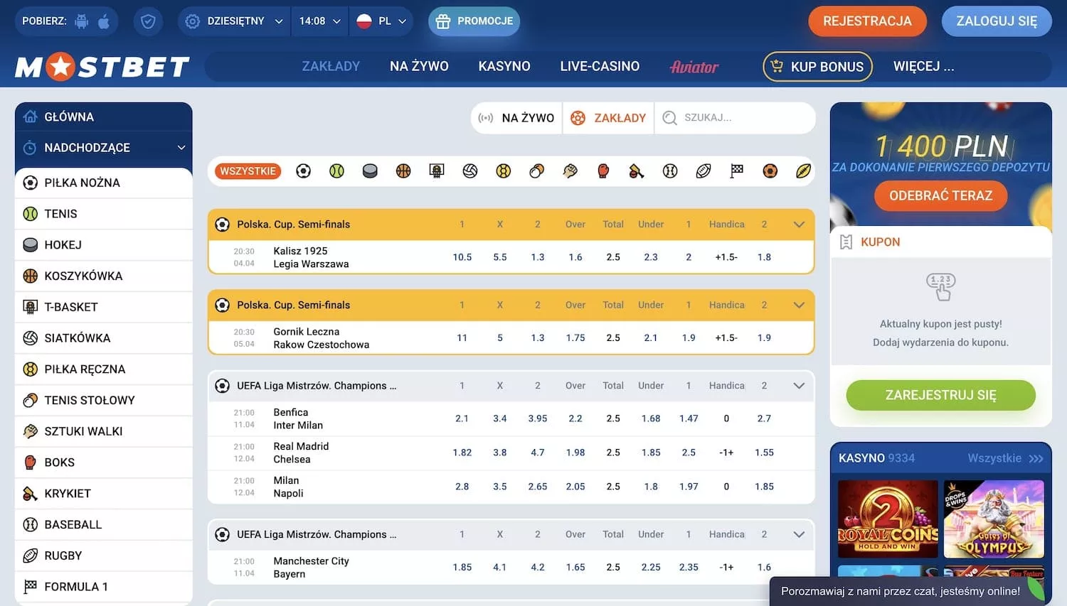 Obstawianie meczy w MostBet jest proste. Należy przejść do listy wydarzeń i wybrać to, na które chce się postawić zakład – przedmeczowy lub na żywo. Należy kliknąć wynik, a na wyświetlonym kuponie wprowadzić kwotę zakładu i kliknąć przycisk “Obstaw zakład” i gotowe.