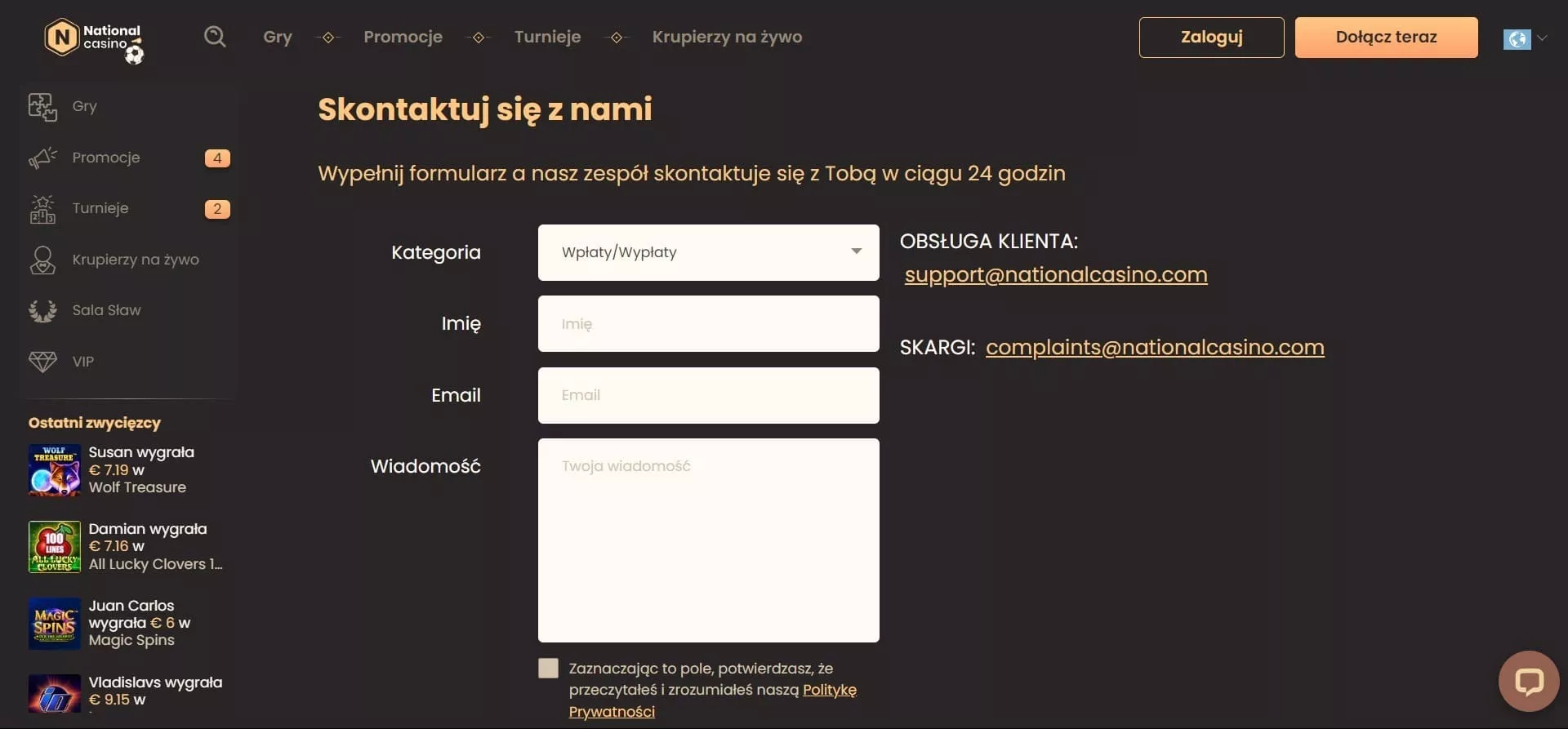 National Casino oferuje kompleksowe wsparcie dla graczy, co jest istotnym aspektem, którego nie mogłaby pomijać nasza recenzja National kasyno online dla polskich graczy 2026. Poniżej przedstawiamy dostępne kanały wsparcia: