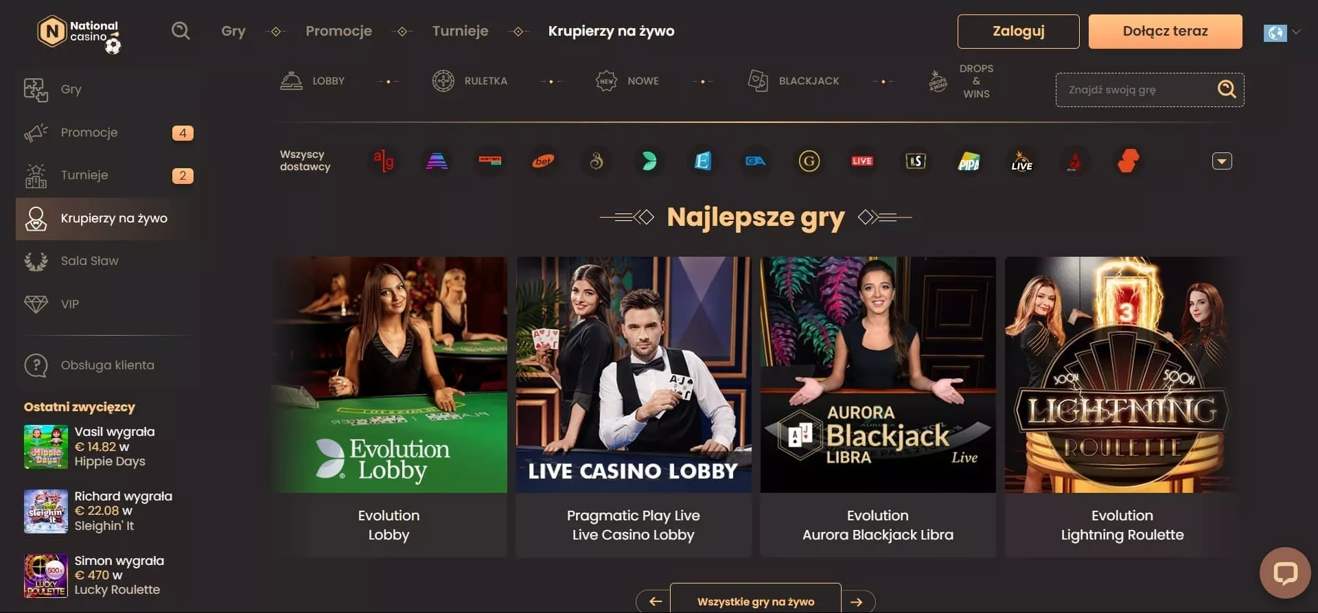 National Casino oferuje szeroką gamę gier z krupierem na żywo, pozwalając graczom na interakcję z krupierem i grę w czasie rzeczywistym. Jest tam kilkaset gier od producentów jak Evolution Gaming czy Pragmatic Live. Wśród nich znajdują się: