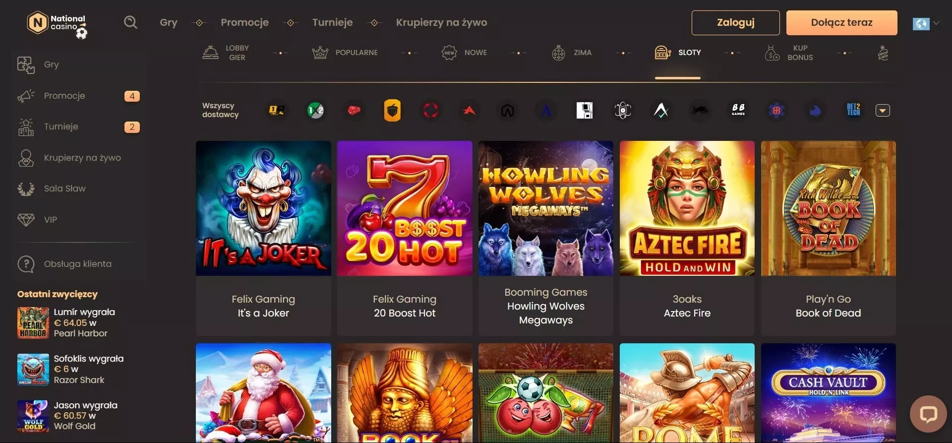 W kasyno National gra online to niebywale ekscytujące przeżycie. Znajdziemy tutaj bowiem niezwykle bogaty wybór gier, które z pewnością zadowolą polskich graczy. Oferta kasyna obejmuje tysiące tytułów, w tym zarówno najnowsze sloty, jak i klasyczne gry stołowe. Poniżej szczegółowo omawiamy tu dostępne w kasynie automaty, jackpoty czy gry z prawdziwym krupierem.