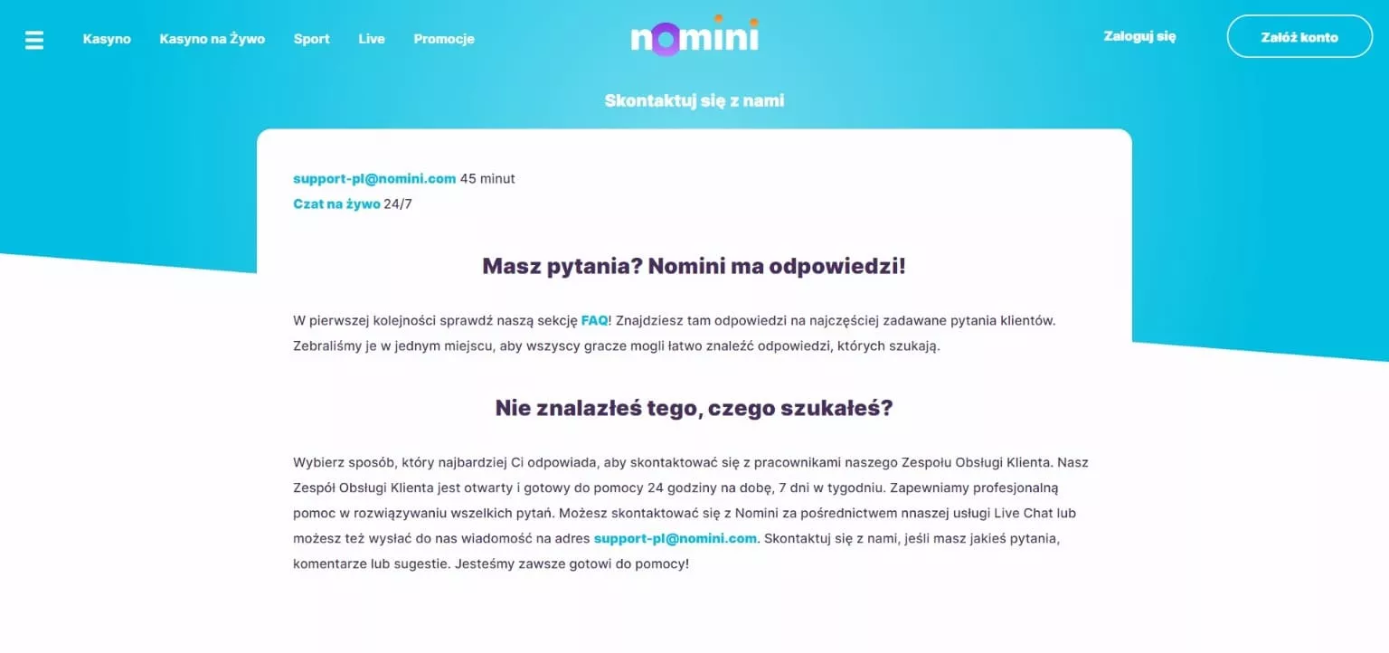adresu e-mail support-pl@nomini.com – pracownicy kasyna odpowiedzą na pytanie w czasie do 45 minut