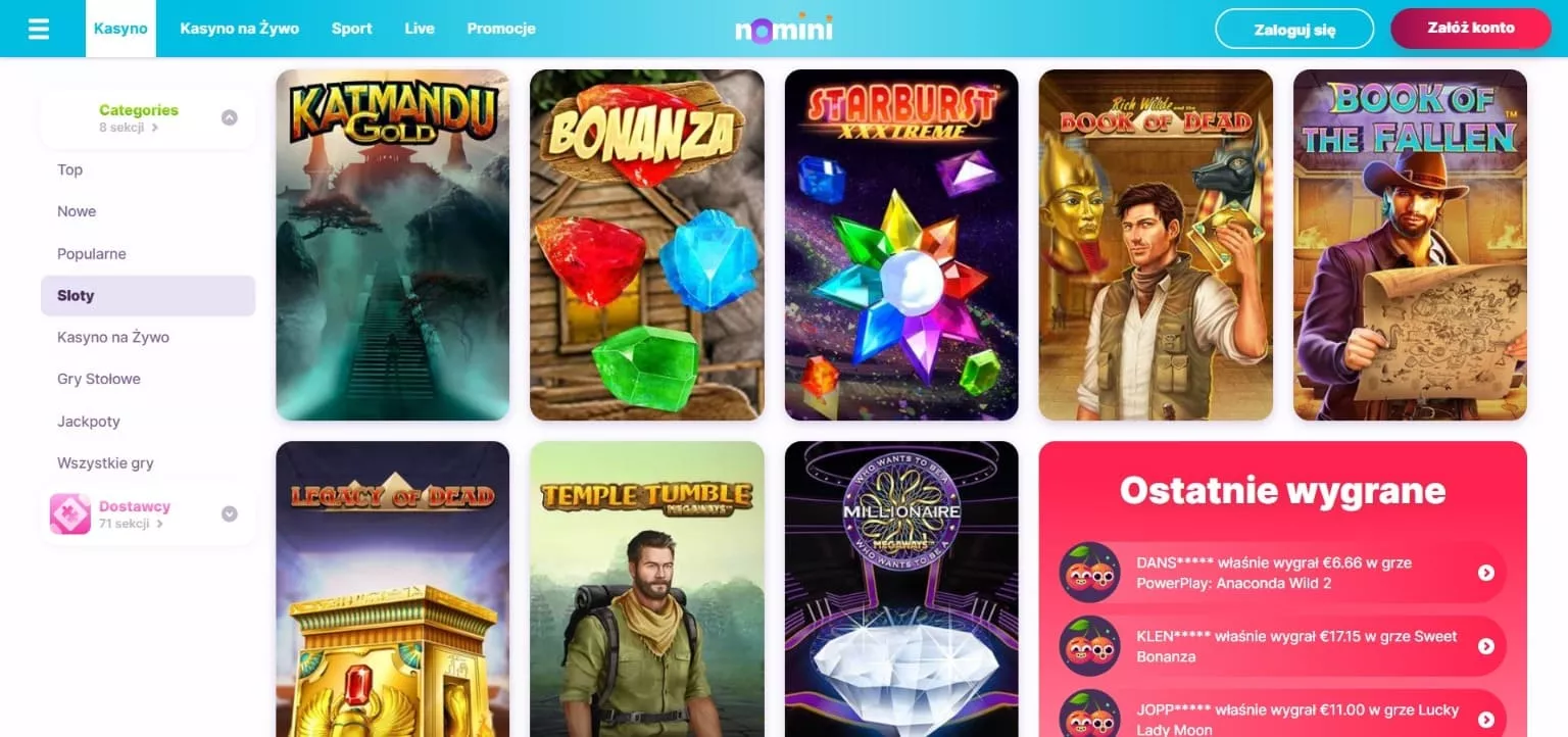 Tym, co wyróżnia ten portal hazardowy, jest nie tylko prosta nawigacja, szybka rejestracja w kasynie Nomini i doskonała obsługa klienta, ale także katalog gier kasynowych, w którym znajduje się ponad 4100 najróżniejszych gier – od automatów online po gry stołowe typu ruletka i blackjack, aż po gry w kasynie na żywo. Wszystkie nowoczesne i przyjazne urządzeniom mobilnym gry są regularnie dostarczane przez ponad 60 dostawców gier, wśród których są wyłącznie sprawdzone i renomowane marki deweloperów oprogramowania kasynowego.