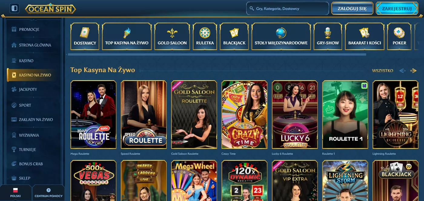 Sekcja gier na żywo w Oceanspin Casino obejmuje ponad 50 stołów prowadzonych przez profesjonalnych krupierów z Evolution Gaming oraz innych renomowanych dostawców gier live. Weryfikowaliśmy jakość transmisji – strumienie działają w rozdzielczości HD z minimalnym opóźnieniem. Gry live są dostępne całą dobę.