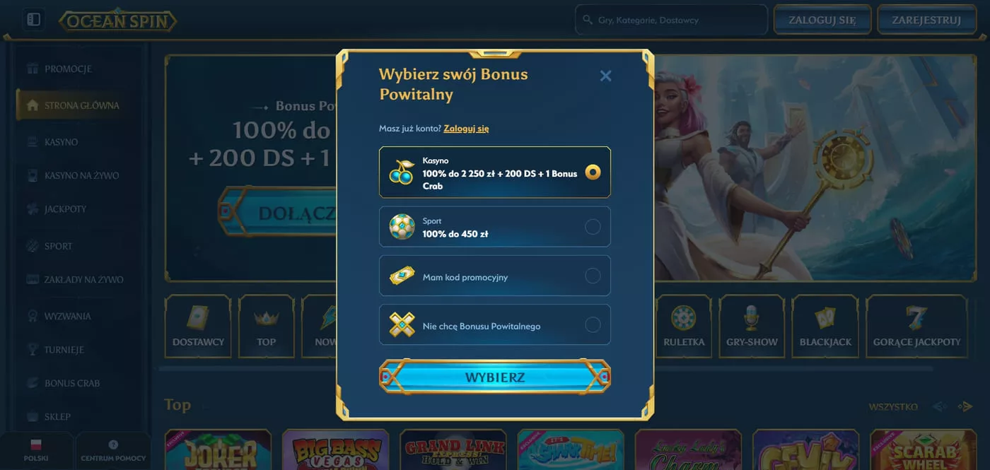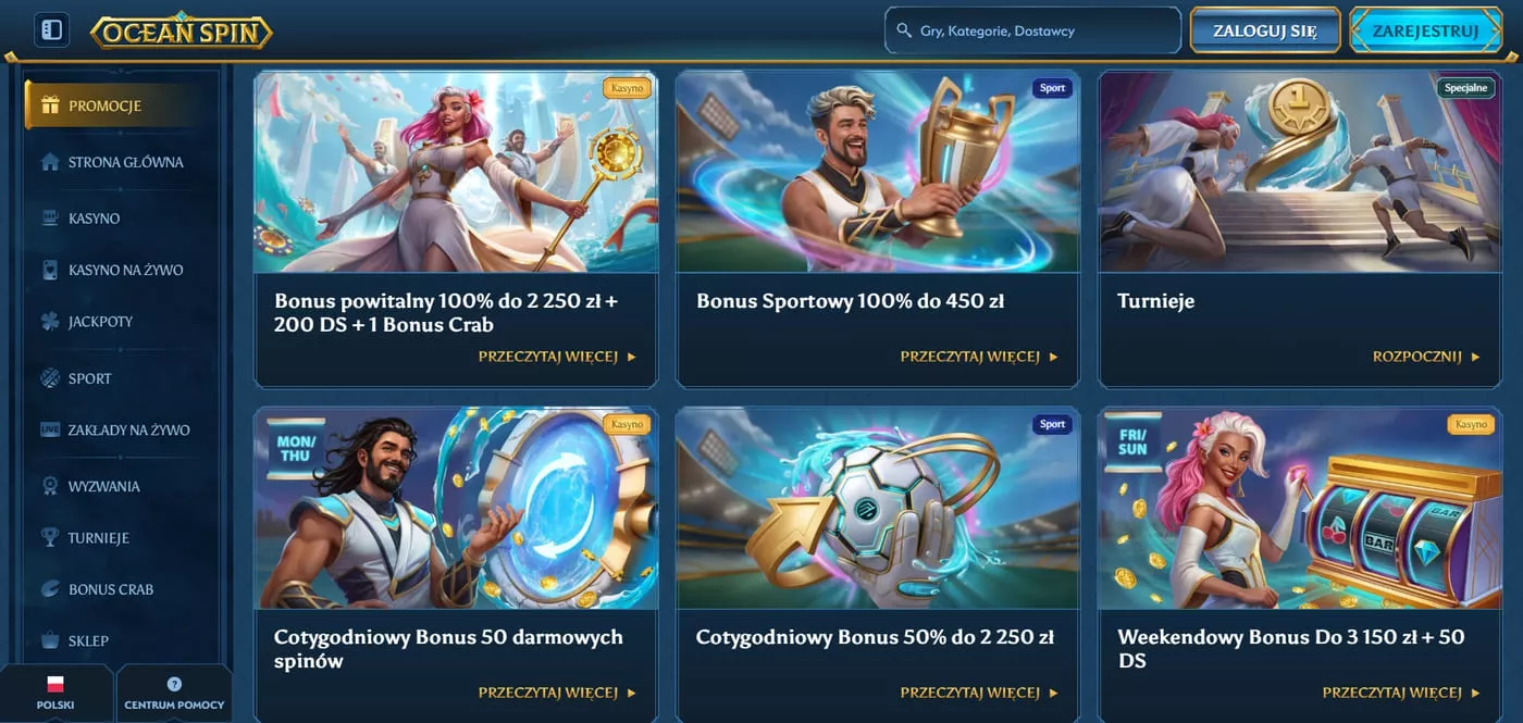 Oceanspin Casino oferuje nowym użytkownikom atrakcyjne bonusy w postaci pakietu startowego wartego 100% do 2250 PLN, 200 darmowych spinów oraz 1 Bonus Crab. Minimalna wpłata wynosi 90 PLN, co pozwala aktywować pierwszą ofertę bonusową.