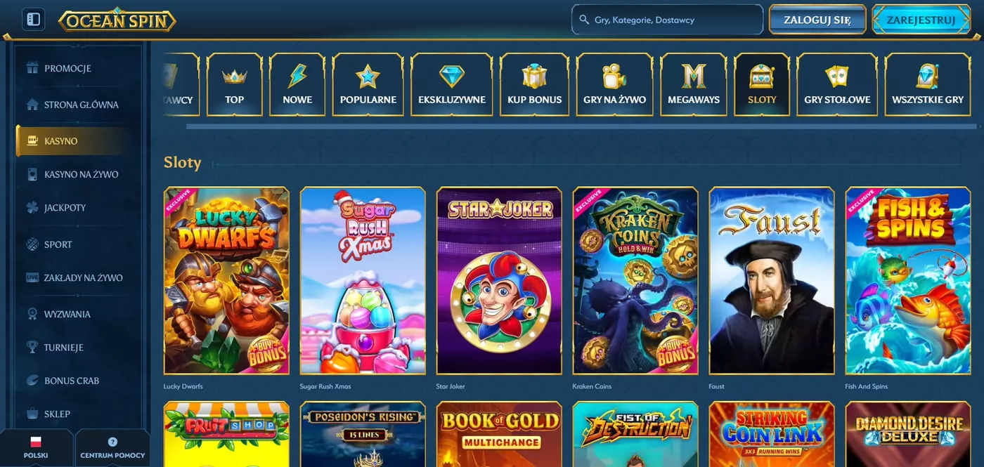 Biblioteka kasyna Oceanspin przekracza 11 000 tytułów dostarczanych przez renomowanych dostawców gier. Współpraca z ponad 100 producentami oprogramowania zapewnia różnorodność rozrywki dla polskich graczy. Średni wskaźnik RTP w Ocean Spin Casino wynosi około 96%, co odpowiada standardom branżowym w kasynach online.