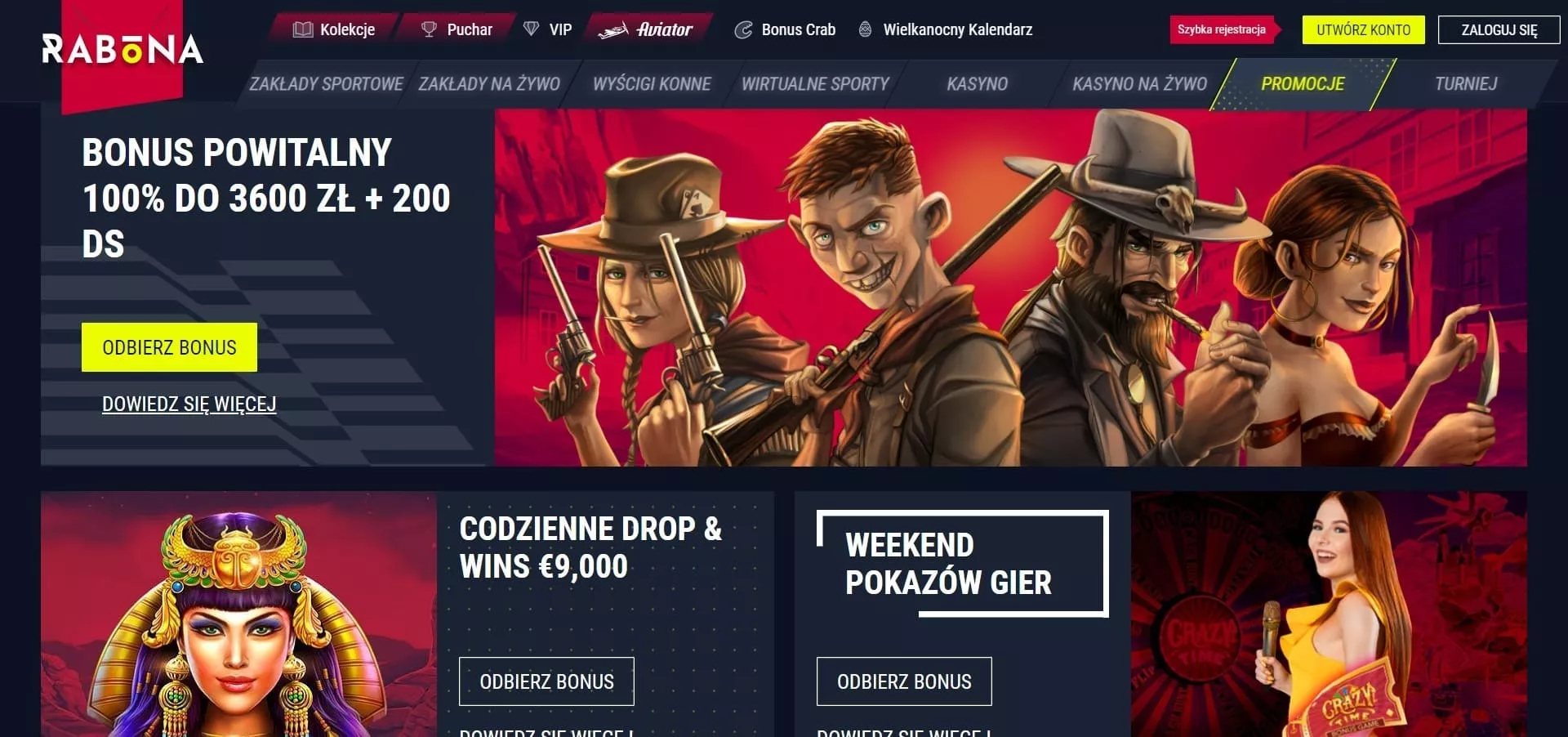 W kasynie online Rabona Casino pl czekają oprócz fantastycznych gier, także ciekawe bonusy oraz promocje. Jedną z nich jest bonus powitalny dla nowych graczy, którzy założą konto i zapłacą minimalny depozyt w kwocie 90 złotych. W ramach owego bonusu powitalnego, użytkownika otrzyma do 100% doładowania do pierwszego depozytu. Maksymalna kwota doładowania wynosi 3600 złotych. Do tego kasyno dorzuca pakiet 200 bezpłatnych kręceń bez depozytu, do wykorzystania w grach na automatach. Pula 200 darmowych spinów podzielona jest na pakiety po 20 spinów, a wypłacane one są przez 10 dni.