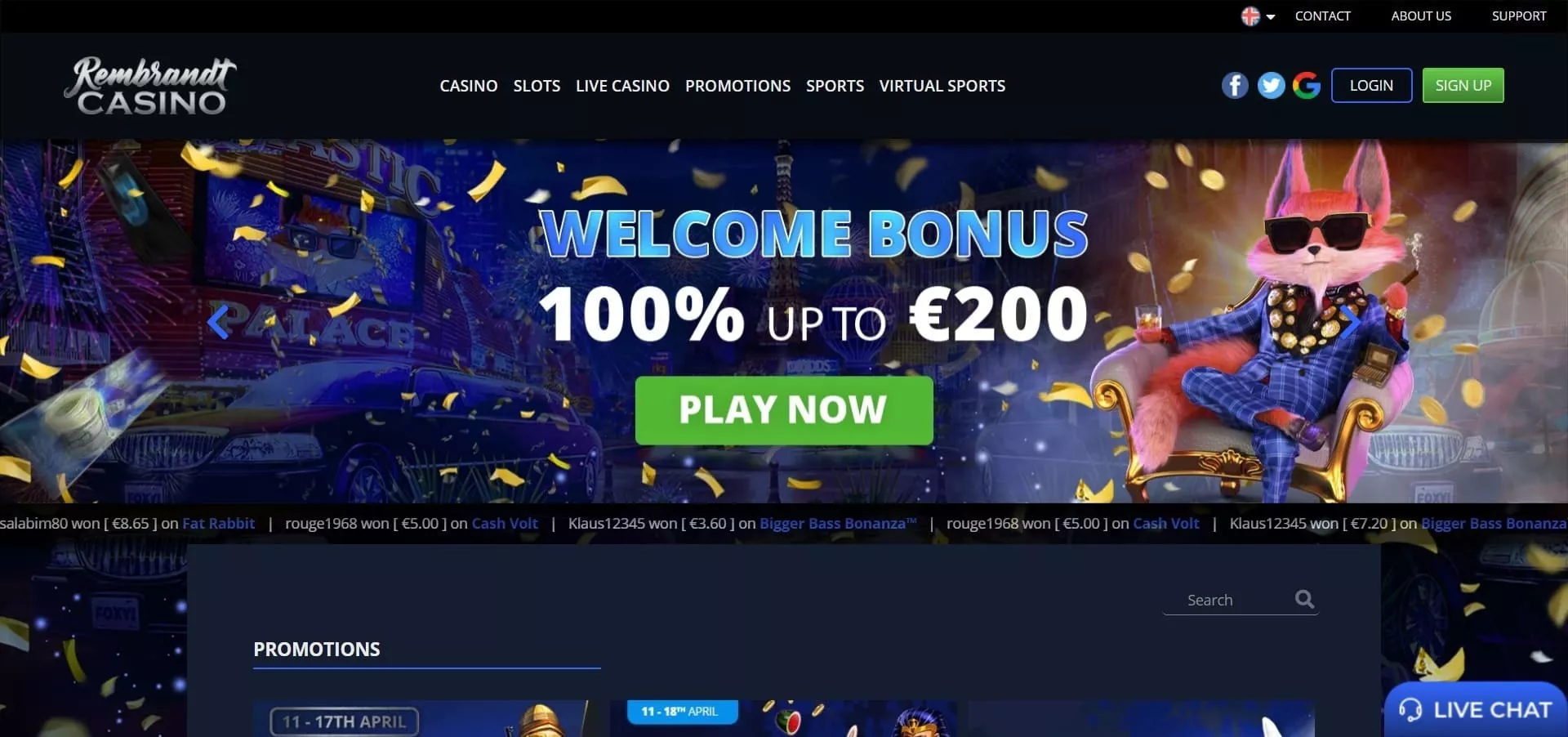 Dodaj wybór popularnych metod płatności i ponad 2000 slotów i gier kasynowych, pomogą zrozumieć, dlaczego nasi recenzenci Rembrandt Casino mogą Ci polecić to kasyno. Zarejestruj się w Rembrandt Casino i odbierz swój Rembrandt Casino bonus code powitalny już dziś.