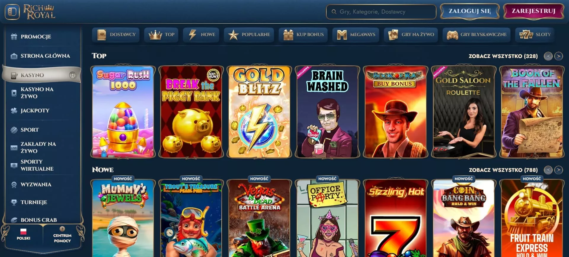 Kasyno online posiada w swoim asortymencie ponad 10000 gier pochodzących od ponad 90 dostawców. Gry kasynowe Richroyal obejmują następujące kategorie: automaty (sloty), gry stołowe, gry na żywo, gry z jackpotami, automaty z mechaniką Megaways, tytuły z funkcją „kup bonus”, błyskawiczne mini-gry oraz klasyczne wersje ruletki i blackjacka.