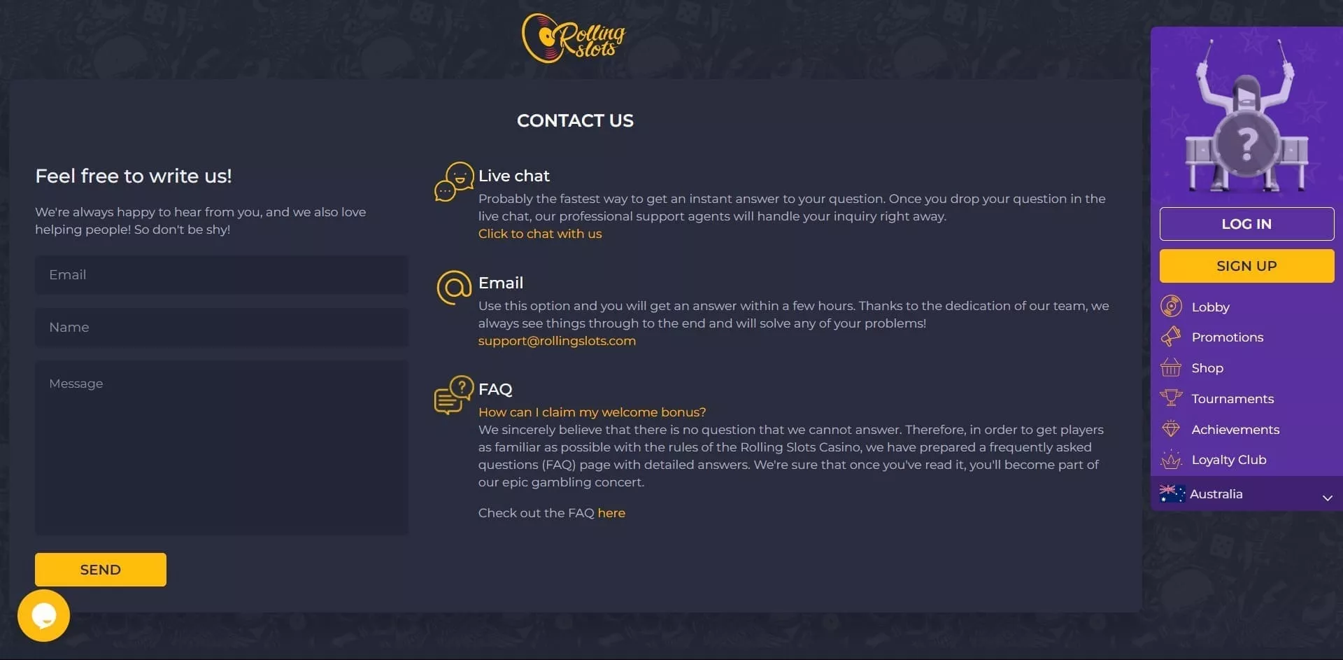 Pomimo tego, że kasyno Rolling Slots, jest na rynku od niespełna roku, to stawia na jakość kontaktu z klientem. Dlatego w razie jakiegokolwiek problemu lub pojawienia się pytania w głowie gracza, to warto jest zadać konsultantowi z biura obsługi klienta.