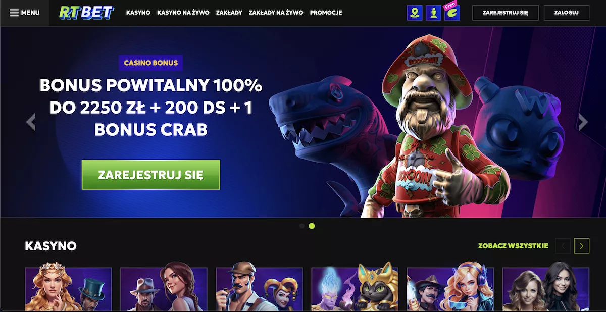 Rozmiar bonusu – 100% do 2250 zł, 200 darmowych spinów, 1 Bonus Crab w RTbet kasyno