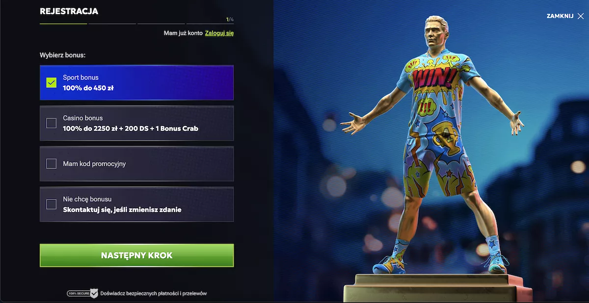 Z sekcji Promocje wybierz swój bonus powitalny.