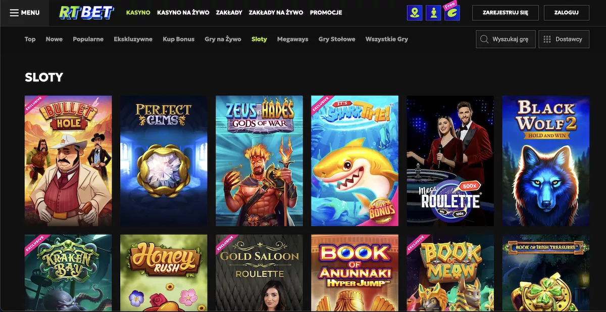 W kasynie RTbet polscy gracze znajdą różnorodne katalogi gier, obejmujące ponad 4000 tytułów. W górnym menu dostępne są następujące kategorie: Top, Nowe, Świąteczne, Popularne, Ekskluzywne, Kup Bonus, Gry na żywo, Sloty, Megaways, Gry stołowe. Oto informacje na temat wszystkich głównych rodzajów gier w ofercie.
