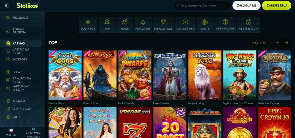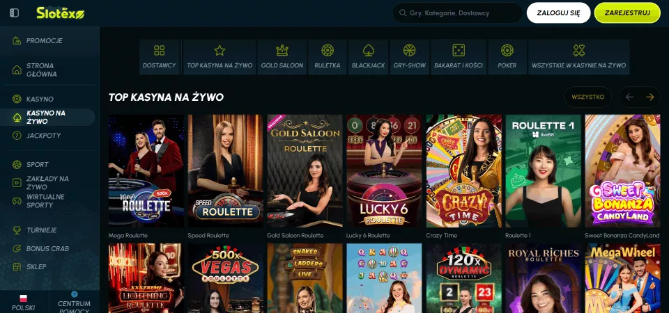 Oferta dla Polaków została przygotowana na bazie gier pochodzących od 97 dostawców oprogramowania. Wchodząc do lobby gier, Slotexo Casino gry na pieniądze mogą być filtrowane według dostawców w każdej osobnej sekcji oraz kategorii: gry online, sloty, gry na żywo czy gry natychmiastowe.