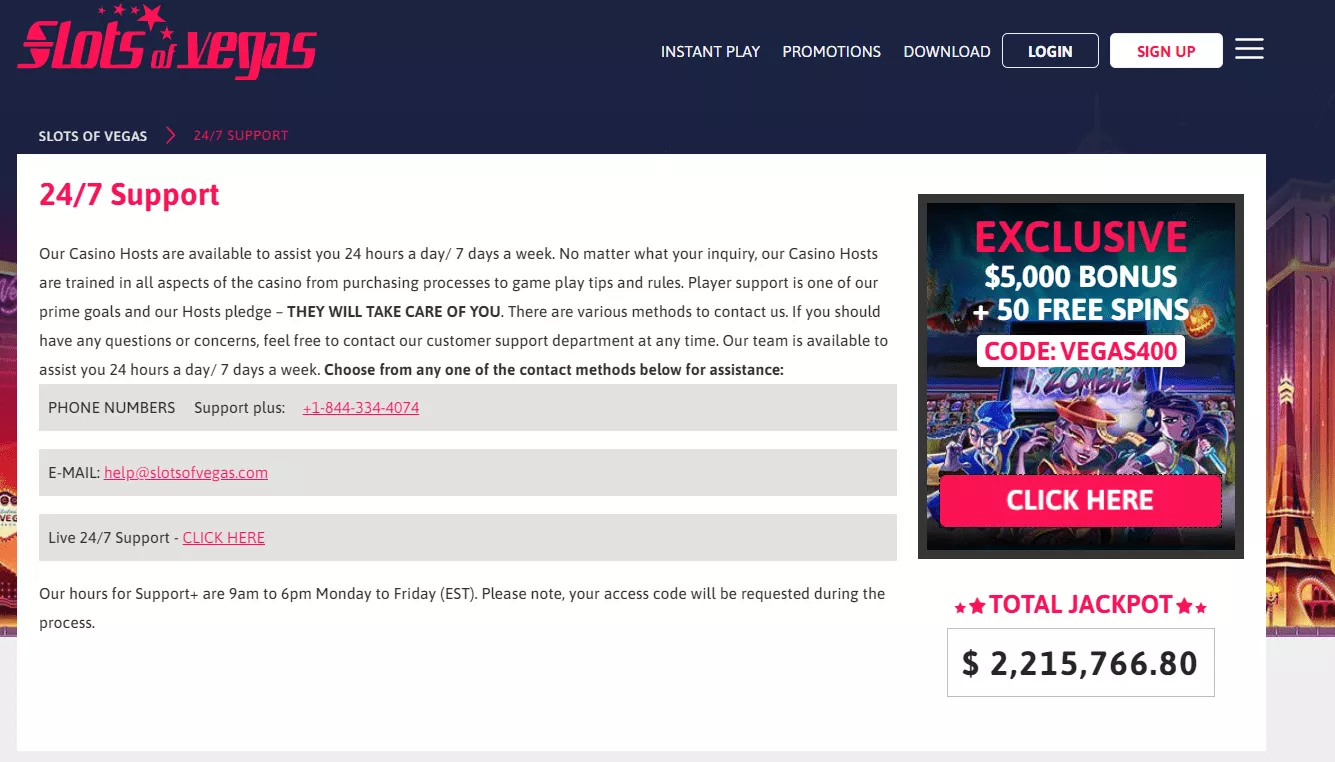 Slots of Vegas Online Casino zostalo zalozone w 2004 roku. Zatem miejsce to dziala nieprzerwalnie juz dwanascie lat. Gracze Casino Slots of Vegas otrzymuja pierwszej klasy obsluge i moga cieszyc sie najlepszymi promocjami. Przedstawiciele obslugi klienta niniejszego kasyna sa dostepni 24/7, a takze sa gotowi, aby pomoc rozwiazac wszelkie problemy graczy.